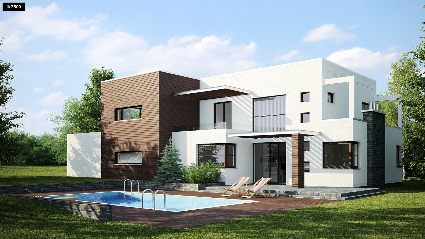 Zx1 to nowoczesny i funkcjonalny dom o eleganckiej formie architektonicznej i efektownie ukształtowanej przestrzeni wewnętrznej. Projekt nawiązuje do kompozycji domów modernistycznych, zarówno bryłą jak i programem funkcjonalnym. Połączenie bieli oraz orzechowego drewna na elewacjach wraz ze stalowymi lekkimi daszkami i pergolami tworzy spójną całość o wysokiej estetyce. Zaletą jest obszerny, dwustanowiskowy garaż. Przestrzenne powiązanie salonu z kuchnią oraz duże powierzchnie przeszkleń w ścianie ogrodowej potęgują wrażenie przestronności i naturalnie doświetlają wnętrze. Pustka nas salonem podkreśla nowatorski charakter domu. Galeria na piętrze służy nie tylko komunikacji, odpowiednio zaaranżowana może stać się centrum wypoczynku. W strefie nocnej znajdują się trzy wygodne sypialnie oraz komfortowa łazienka. Każdy z pokoi posiada wyjście na taras. Projekt Zx1 będzie domem wyróżniającym się w sąsiedztwie nie tylko detalem, ale i kubistyczną formą.