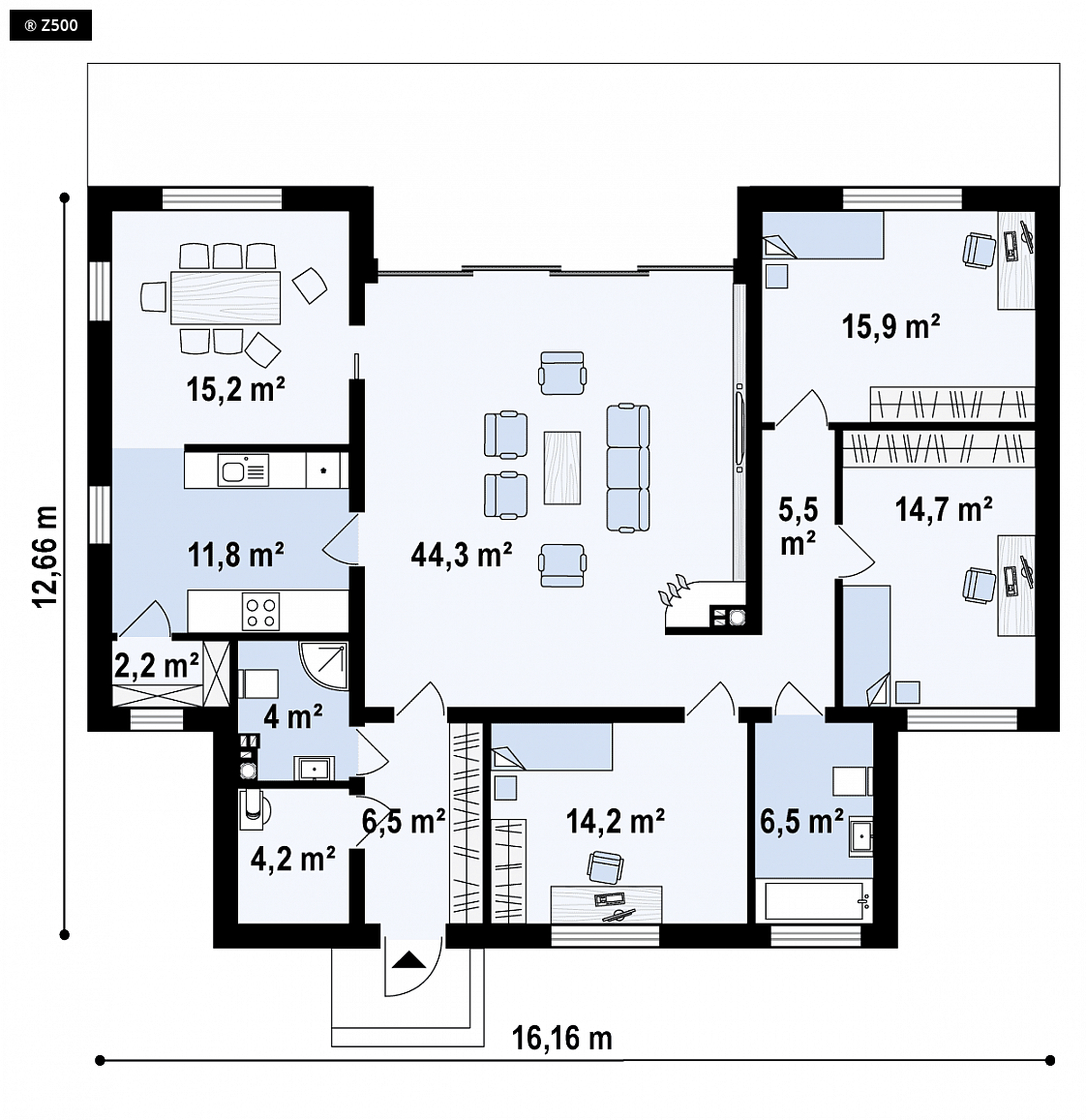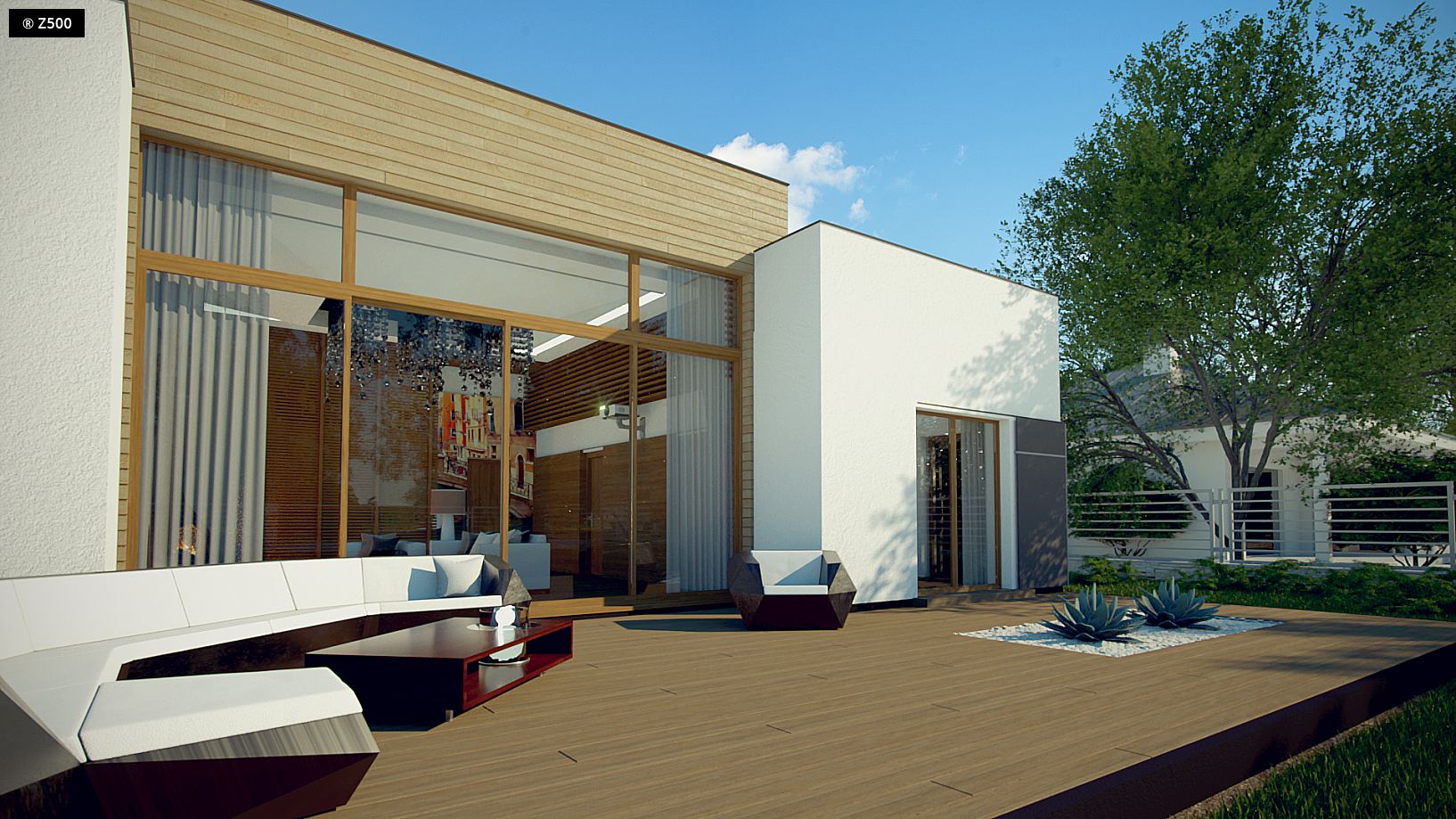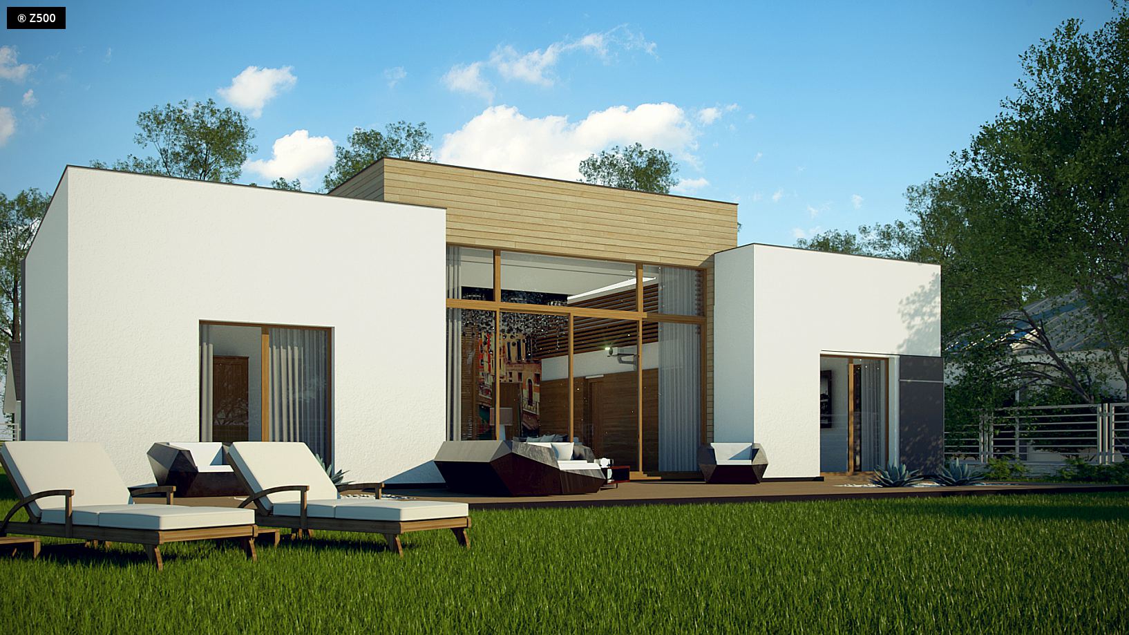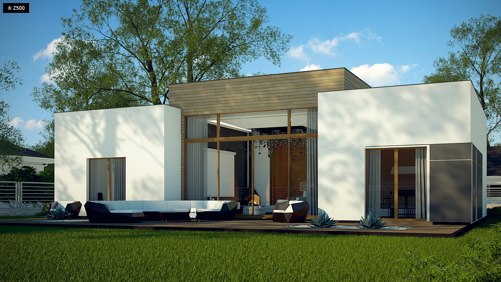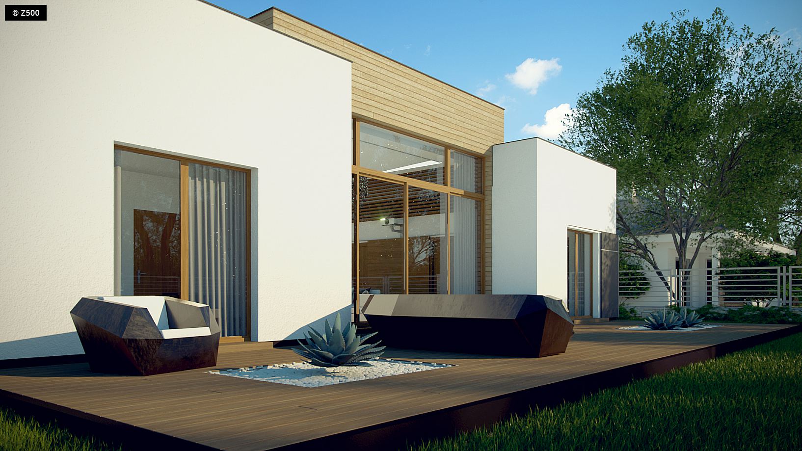 Zx111 jest nowoczesnym domem średniej wielkości, z płaskim dachem, w którym połączenie bieli, szarości, drewna i dużych salonowych przeszkleń podkreśla jego osobliwy wygląd z zewnątrz, a przestrzenny, podwyższony salon, wewnątrz domu. W projekcie Zx111 dzienna strefa życia mieszkańców usytuowana jest tak jak ogród w budynkach atrialnych - w samym centrum domu - i stanowi jego serce. Duże salonowe przeszklenia i kominek, oraz ściany pomalowane na biało, które na których można wyświetlać projekcje filmowe, nadają osobliwego klimatu, dzięki czemu wszyscy domownicy i goście chętnie przebywają w tej części domu sprawiając, że tętni on życiem. Dodatkowo w korytarzu możemy dostawić ażurową ścianę, która spowoduje nieznaczne zmniejszenie powierzchni salonu, jednakże doda pokojom prywatności. Wszystkie pozostałe pomieszczenia przylegają do salonu i stanowią prywatną strefę życia domowników. Jadalnia – większa niż kreślą standardy. Zazwyczaj stół umieszczany jest w salonie a w dedykowanym Państwu projekcie mamy wystarczająco miejsca aby umieścić stół w jadalni i drugi w salonie. Z kuchni mamy dostęp do spiżarki, aby ułatwić przetrzymywanie artykułów spożywczych i sprzątanie po większej ilości gości.