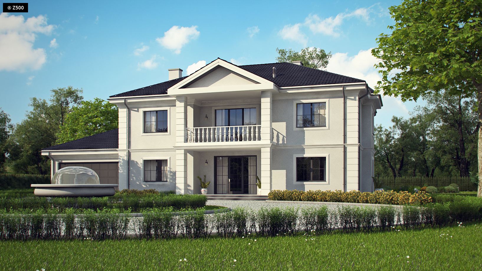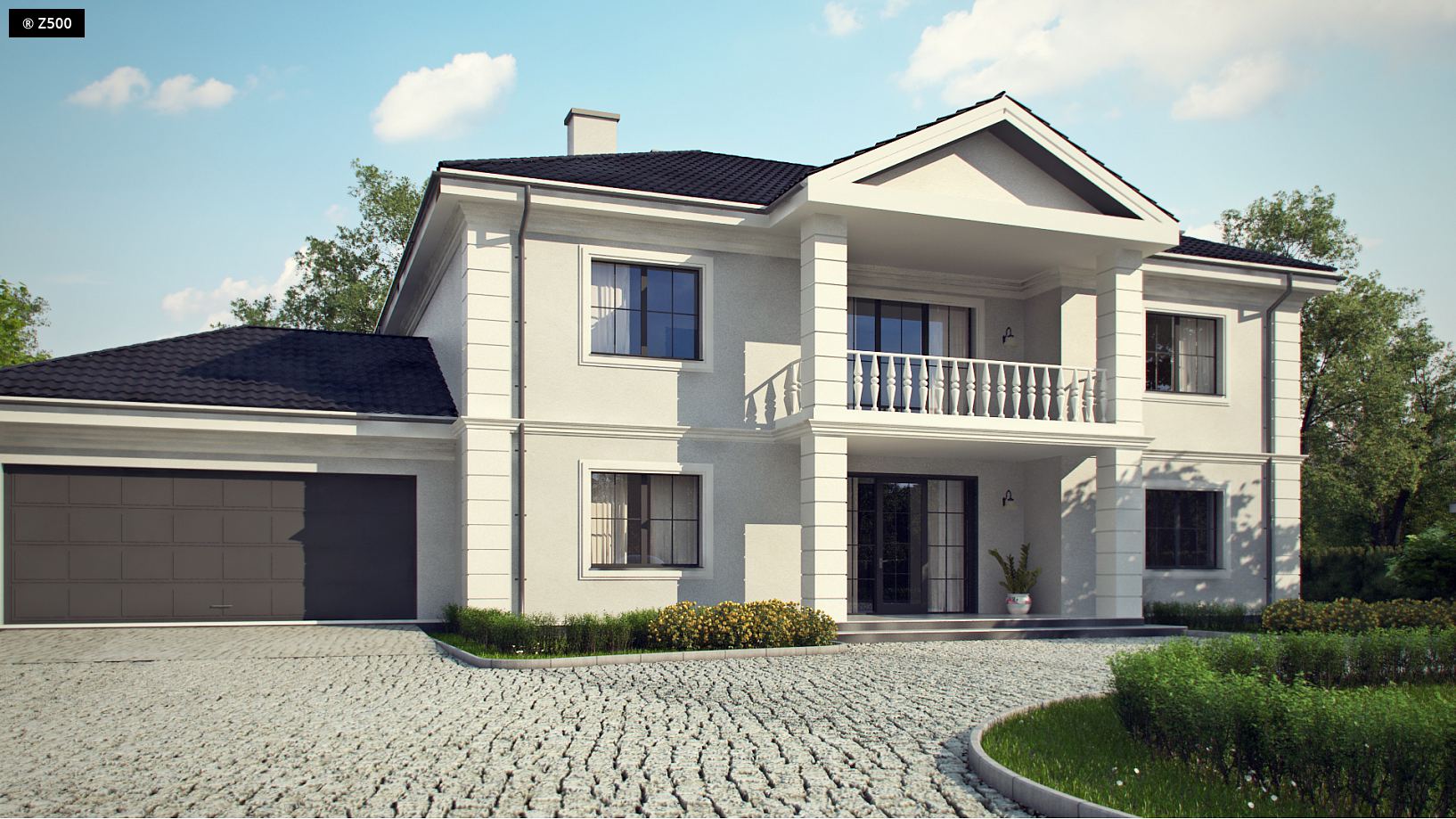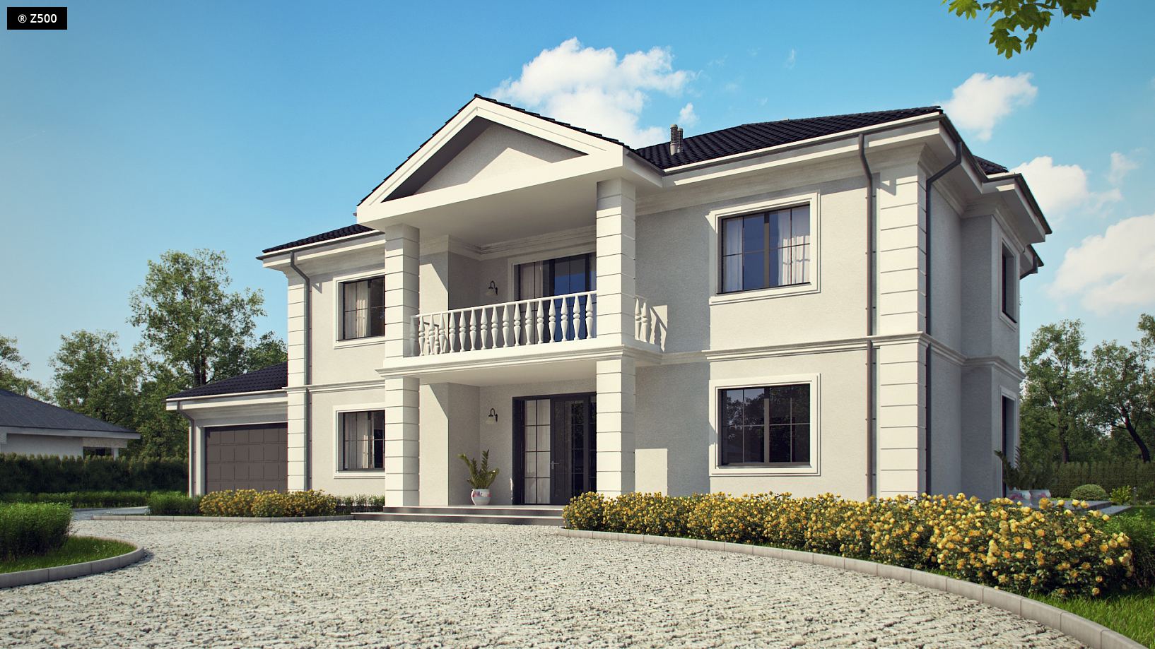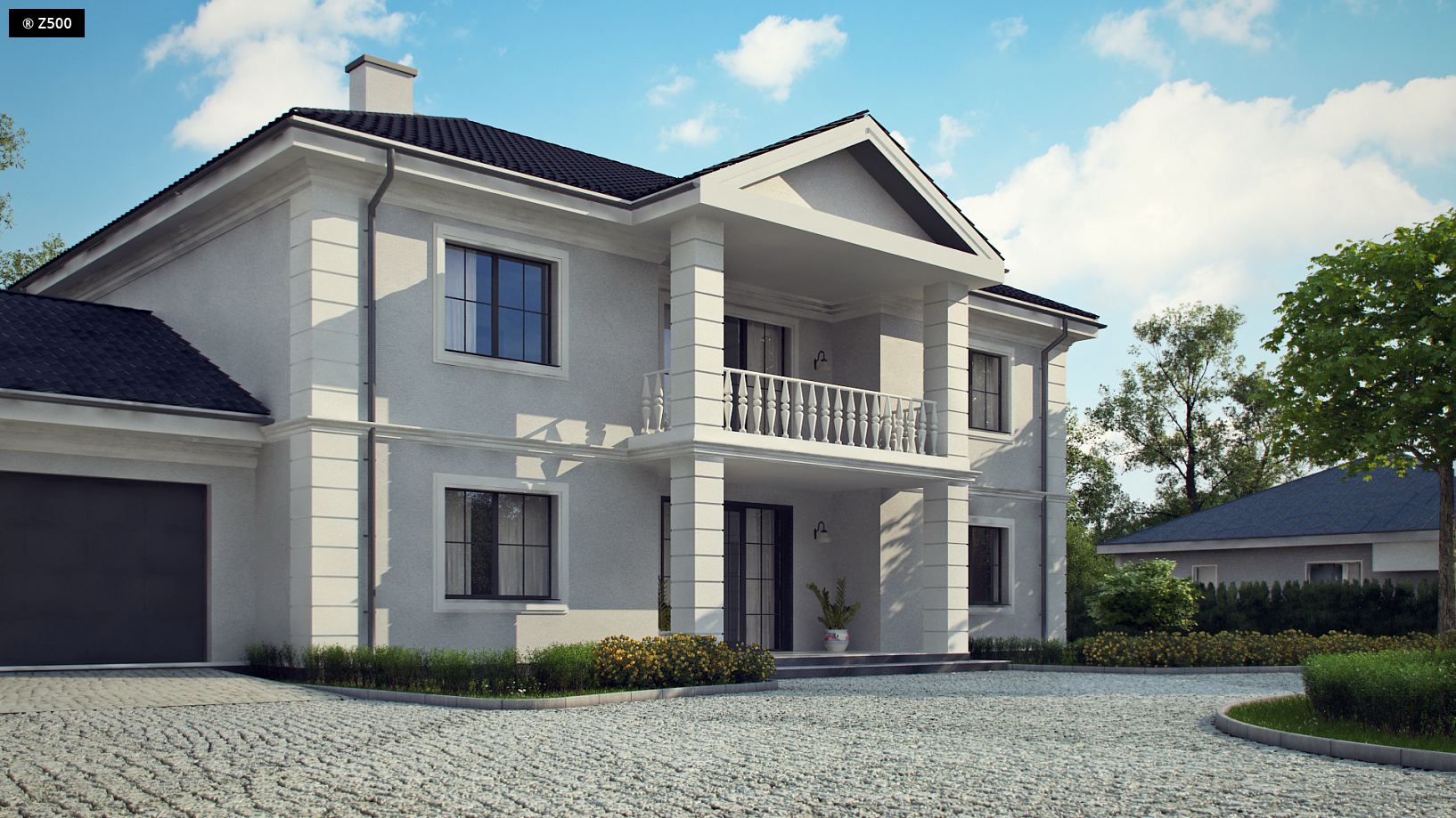 Zx113 to piękny, piętrowy dom w stylu dworkowym. Elegancką, gustowną bryłę przykryto kopertowym dachem i wzbogacono o boniowania oraz o kolumny przy wejściu. Dzięki temu nabrała ona wykwintności i dobrego smaku. Przestrzeń parteru z wydzieloną sauną i prysznicem stanowi odzwierciedlenie pomysłowości architekta, który wychodzi tu naprzeciw marzeniom i potrzebom przyszłych mieszkańców o cichym wypoczynku pozwalającym na regenerację sił ducha i ciała. Dalej architekt projektując otwartą przestrzeń salonu, jadalni i kuchni nie zapomina o umieszczeniu w centrum strefy dziennej zachwycającego kominka. Dzięki niemu osoby nie chcące aby zapachy z kuchni unosiły się nad salonem, z łatwością będą mogły dostawić ściankę działową między salonem a jadalnią lub kuchnią. W lewym skrzydle budynku mieści się dwustanowiskowy garaż z bezpośrednim wejściem do domu. Stamtąd dzieli nas już jedynie kilka kroków od tego aby znaleźć się na piętrze. Piętro odkrywa przed nami również wiele możliwości. Projekt może być wykonany z tarasem nad garażem lub bez, a przestronny hol to wyborne miejsce na ustawienie stołu do gry w bilard lub ping ponga. Spośród czterech sypialni jedna posiada dodatkowo własną dużą łazienkę i miejsce na garderobę. Z racji na ich ustawność, pomieszczą dużą ilość kosmetyków i ubrań. Zx113 jest wysublimowanym i komfortowym projektem skierowanym do osób ceniących sobie kunszt, finezję, harmonię i jednocześnie relaks we własnym domu.