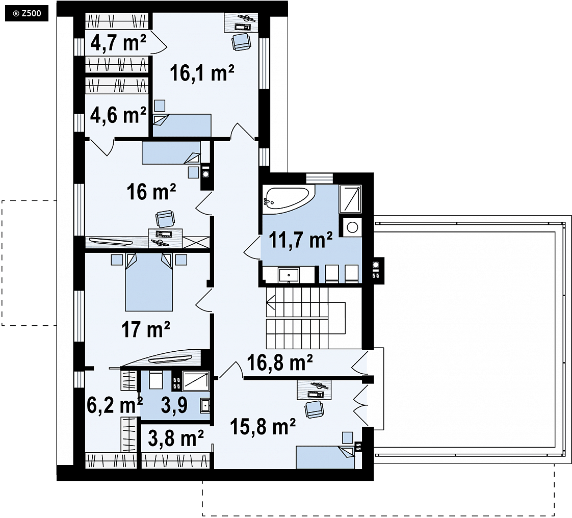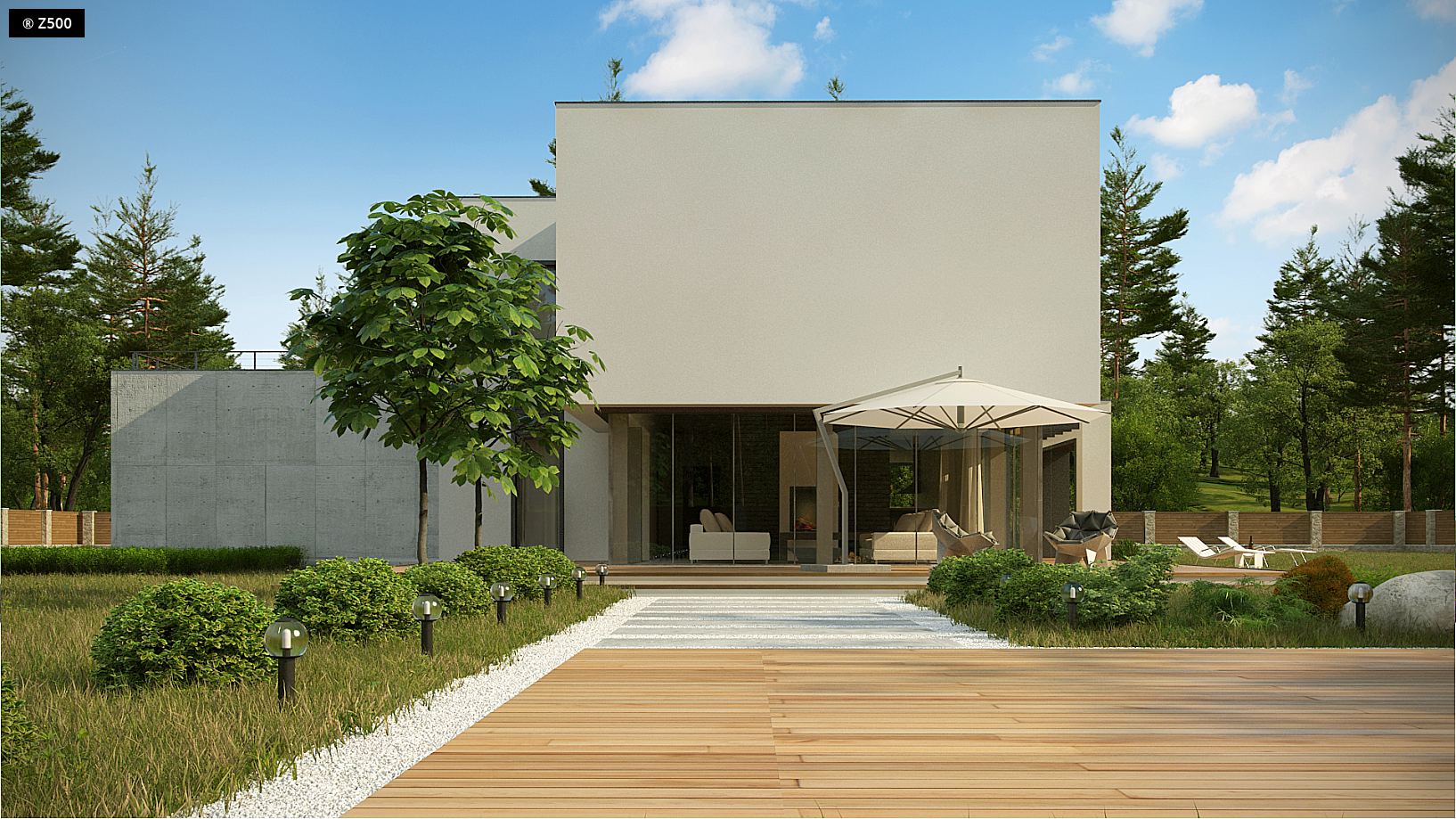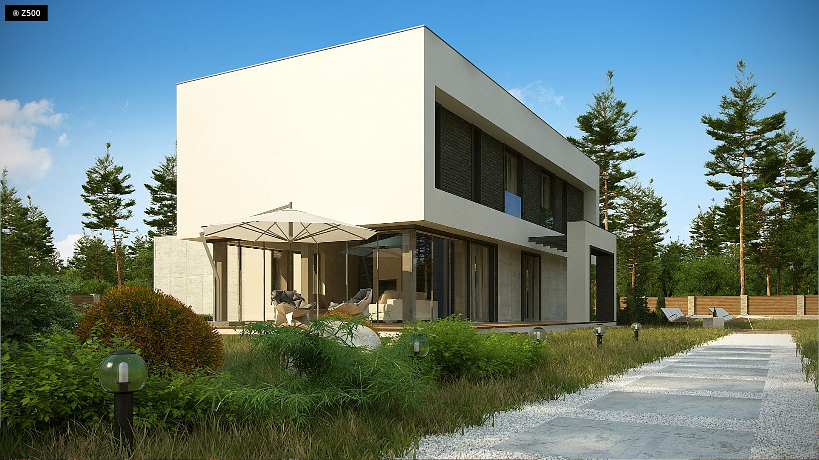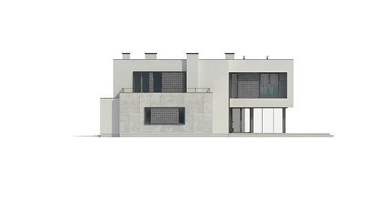 Zx130 Jest propozycją domu dla większej rodziny. Czysta forma, minimalistyczne kształty, nowoczesna bryła i współczesna architektura to główne zalety projektu Zx130. Materiały elewacyjne to beton architektoniczny, biały tynk, i ciemna płytka klinkierowa. 2 stanowiskowy garaż, pomieszczenie gospodarcze i schowek na narzędzia wydzielono w niemieszkalnej części domu. Wejście do środka prowadzi z kilku stron, a przeszklona część salonu dzienna wywołuje złudzenie, że górna bryła jest zawieszona w powietrzu. Całość budynku podzielono na część dzienną i nocną. Na parterze ulokowano przestronny salon, jadalnię i gabinet. Piętro to 4 pokoje. Każdy z nich posiada osobistą garderobę, a dodatkowo sypialnia rodziców wyposażono w łazienkę. Nad garażem znajduje się taras rekreacyjny, który sąsiaduje z dużym pokojem kąpielowym. Stanowi on urozmaicenie układu funkcjonalnego projektowanego budynku. Zx130 jest projektem zadedykowanym dla sporej rodziny lubiącej przestrzeń, wygodę i nowoczesny styl.