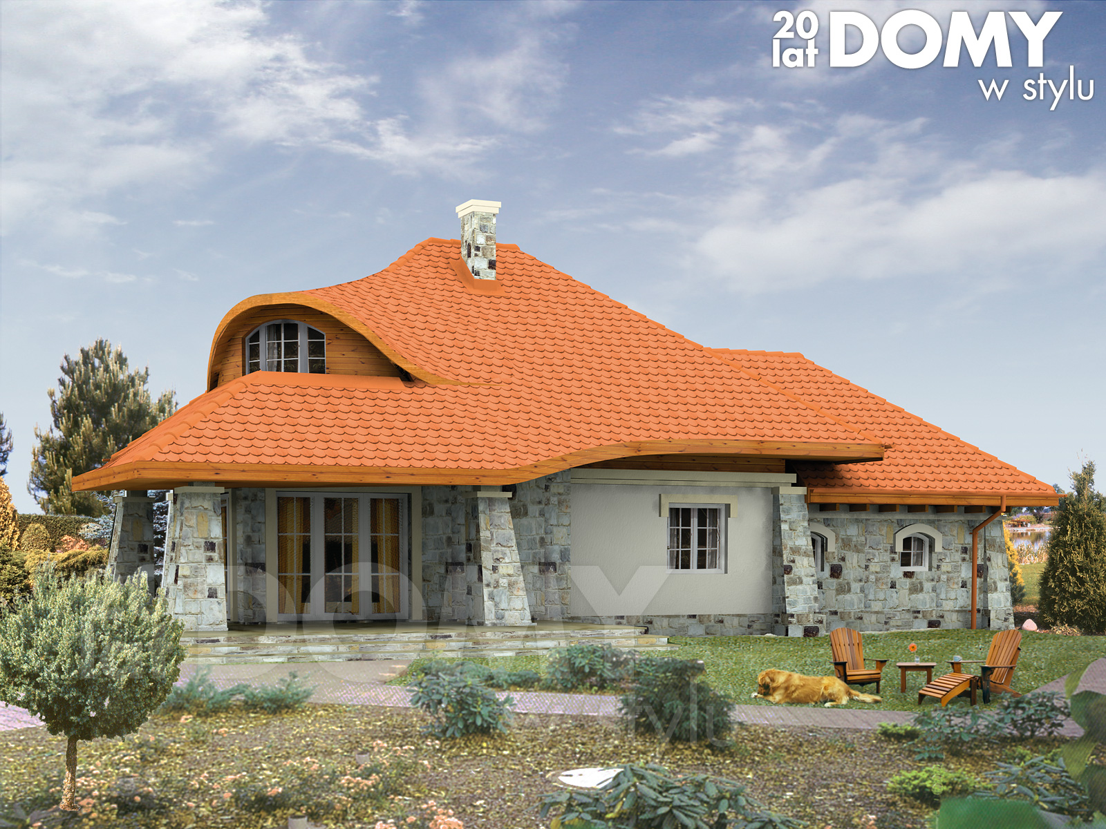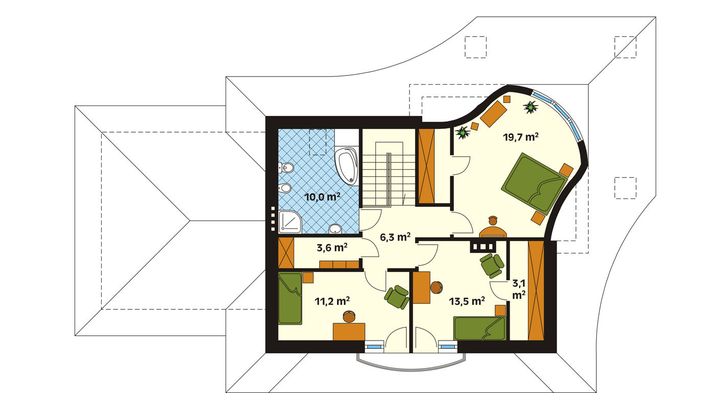 Dom mieszkalny, parterowy z użytkowym poddaszem, niepodpiwniczony. Przeznaczony dla 4 – 5-osobowej rodziny. Na parterze zaprojektowano pokój dzienny z kominkiem, aneksem jadalnym, łazienką i dodatkowy pokój dla seniora lub biuro. Na poddaszu zaprojektowano trzy pokoje, garderobę i łazienkę. Sypialnia rodziców znajduje się w owalnym wykuszu, który nadaje bryle domu niepowtarzalny charakter.