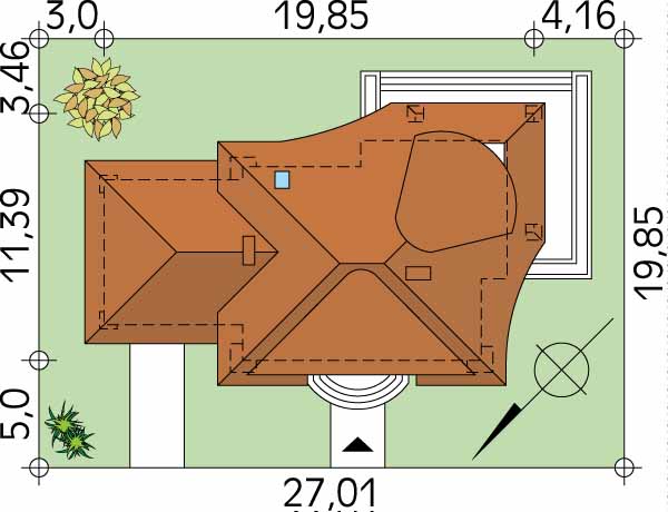 Dach: wielospadowy, nachylenie 38°, pokrycie z dachówki