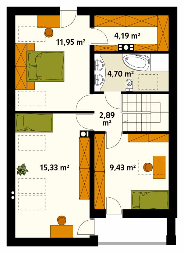 Jednorodzinny dom parterowy z użytkowym poddaszem. Bogaty układ funkcjonalny w nim zaprojektowany, został przystosowany dla potrzeb 4-osobowej rodziny. Na parterze w części dziennej przewidziano: salon z jadalnią, kuchnię ze spiżarnią oraz gabinet, w części gospodarczej kotłownię i łazienkę. Na poddaszu w części nocnej zaprojektowano 3 sypialnie, łazienkę oraz garderobę. W tym projekcie prosta, klasyczna bryła idealnie współgra z nowoczesnymi elewacjami.
