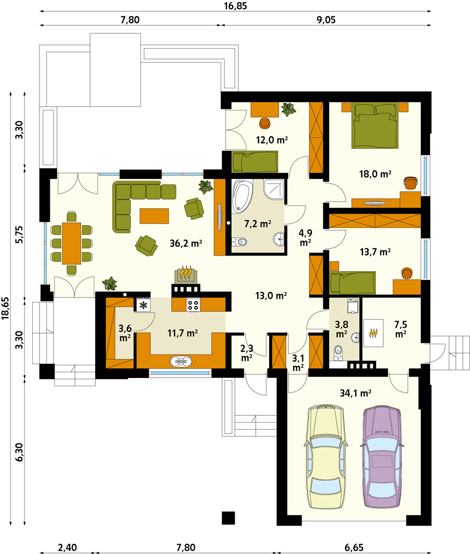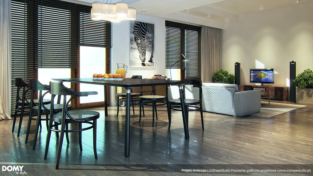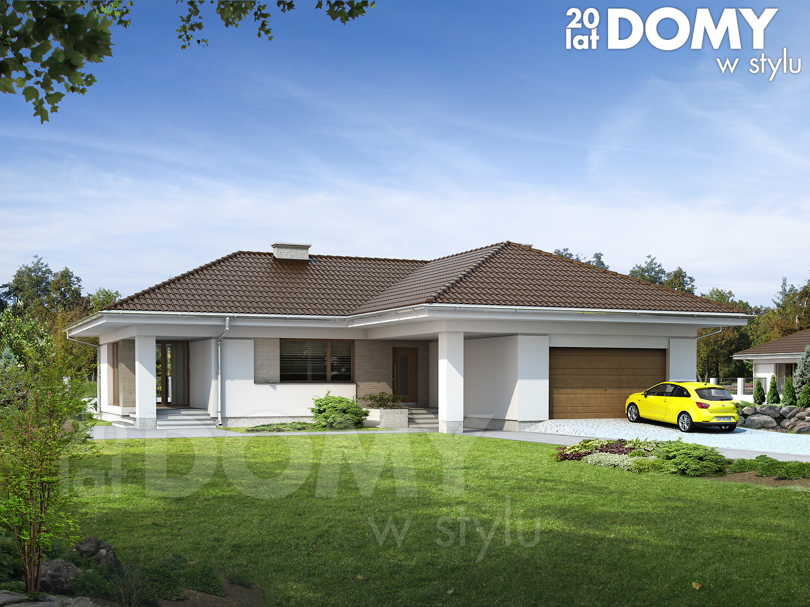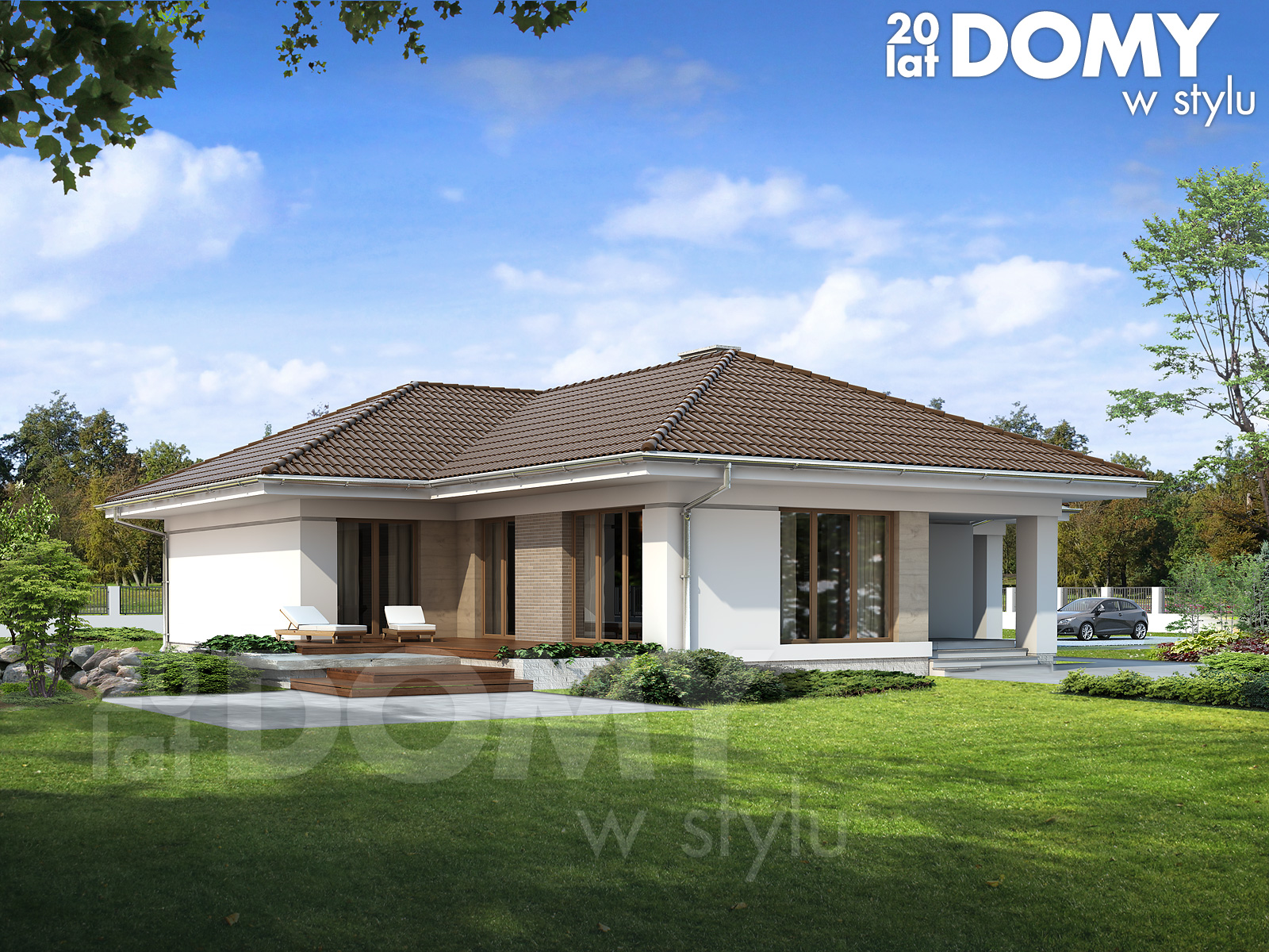Projekt przykuwa uwagę dostojną, ciekawą bryłą, której uroku przydają wszechobecne tarasy dostępne z salonu oraz z jednej z sypialni. W bryle budynku zaprojektowano dwustanowiskowy garaż. To projekt idealny dla 4-osobowej rodziny, która docenia walory domów parterowych. W części dziennej uwagę przykuwa otwarta przestrzeń salonu zaakcentowana dużą ilością przeszkleń oraz obszerny, reprezentacyjny hol. W części nocnej zaprojektowano trzy sypialnie oraz łazienkę. Atutem projektu jest duży dwustanowiskowy garaż, kotłownia oraz spiżarnia usytuowana przy kuchni. Dom zaprojektowany w technologii Multi-Comfort z zastosowaniem produktów marki Saint-Gobain łączy unikalne właściwości produktów z rozsądną ceną. Standard Multi-Comfort oznacza szereg korzyści, takich jak: niskie koszty ogrzewania, komfort termiczny, akustyczny, dobra jakość powierza, bezpieczeństwo przeciwpożarowe (klasa A1). Wszystko to jest możliwe za sprawą zastosowanych w projekcie sprawdzonych materiałów znanych i cenionych marek: Isover, Weber, Rigips, Glassolutions. Produkty Grupy Saint-Gobain są wytwarzane z naturalnych materiałów i posiadają deklaracje środowiskowe. W procesie eksploatacji budynki zaprojektowane w technologii Multi-Comfort posiadają niewielkie zapotrzebowanie na energię pierwotną.
