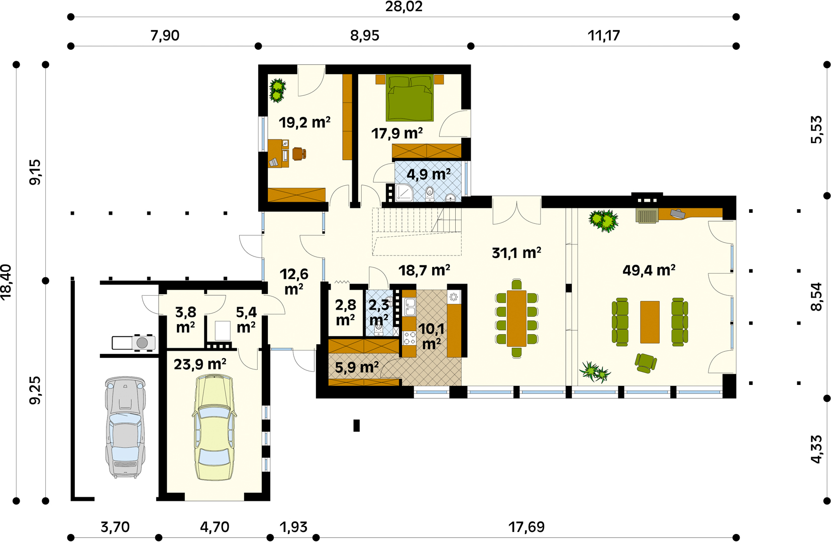 Dom jednorodzinny przewidziany dla wieloosobowej rodziny.Dwie pełne kondygnacje wynikające z nowoczesnej bryły budynku. W obrębie budynku zaprojektowano garaż oraz dodatkową wiatę na samochód. Trzy sypialnie na poddaszu, jedna z indywidualną łazienką.