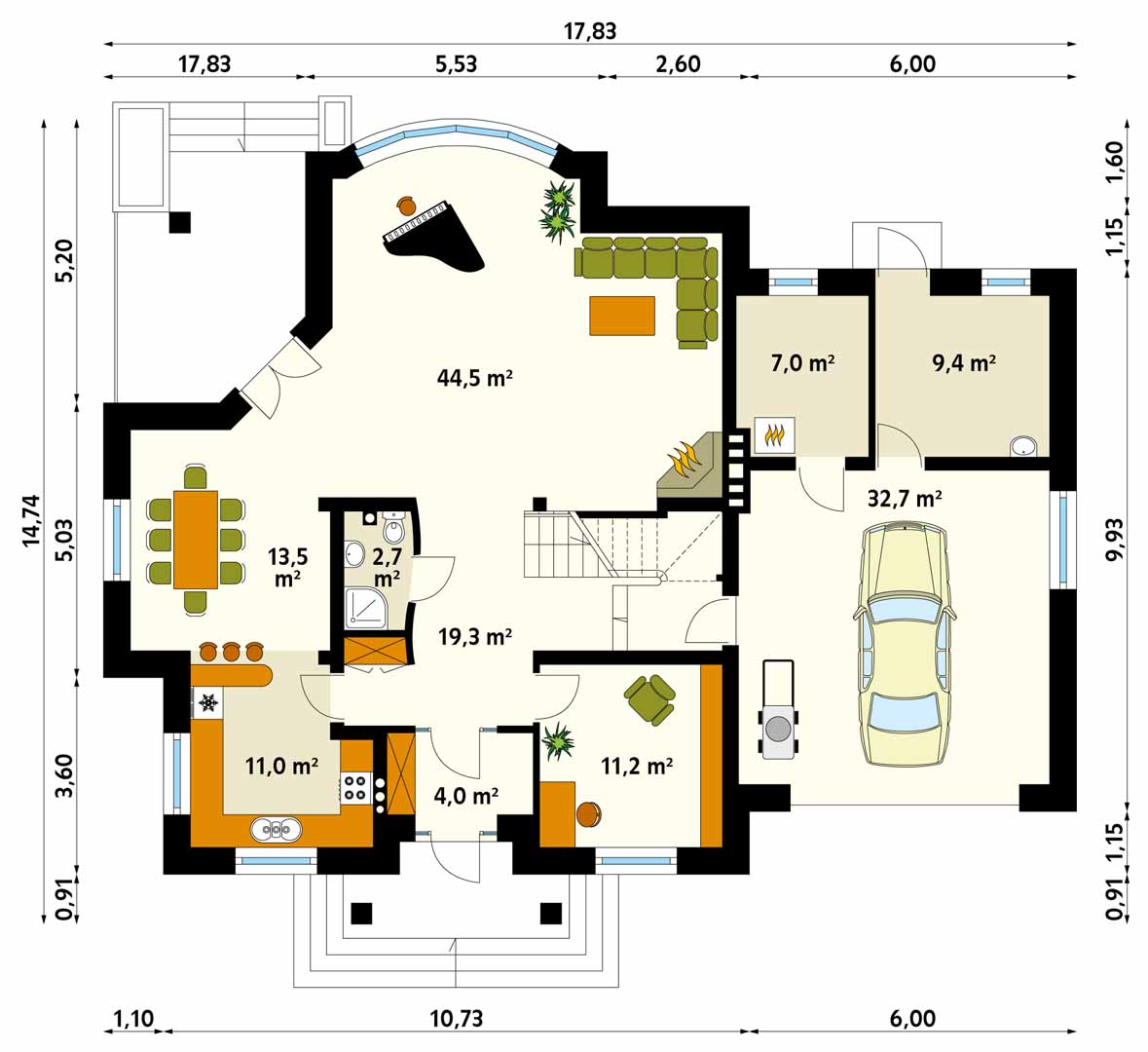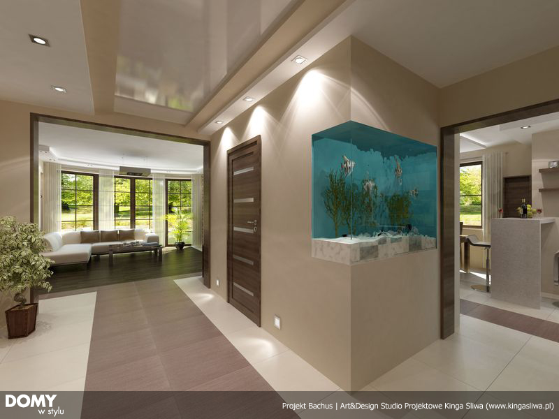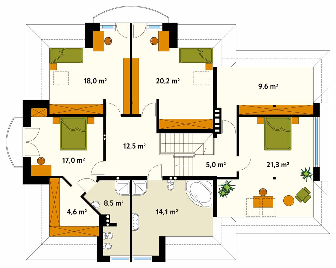 Dom o klasycznych proporcjach przeznaczony dla 4 – 5-osobowej rodziny. Przestronny parter z dodatkowym pokojem – gabinetem. Na osi wejścia zaprojektowano w pokoju dziennym duże, przeszklone okno z widokiem na ogród. Reprezentacyjny dom o rozbudowanej funkcji ucieszy wybrednego inwestora. Istnieje pomniejszona wersja projektu BACHUS.