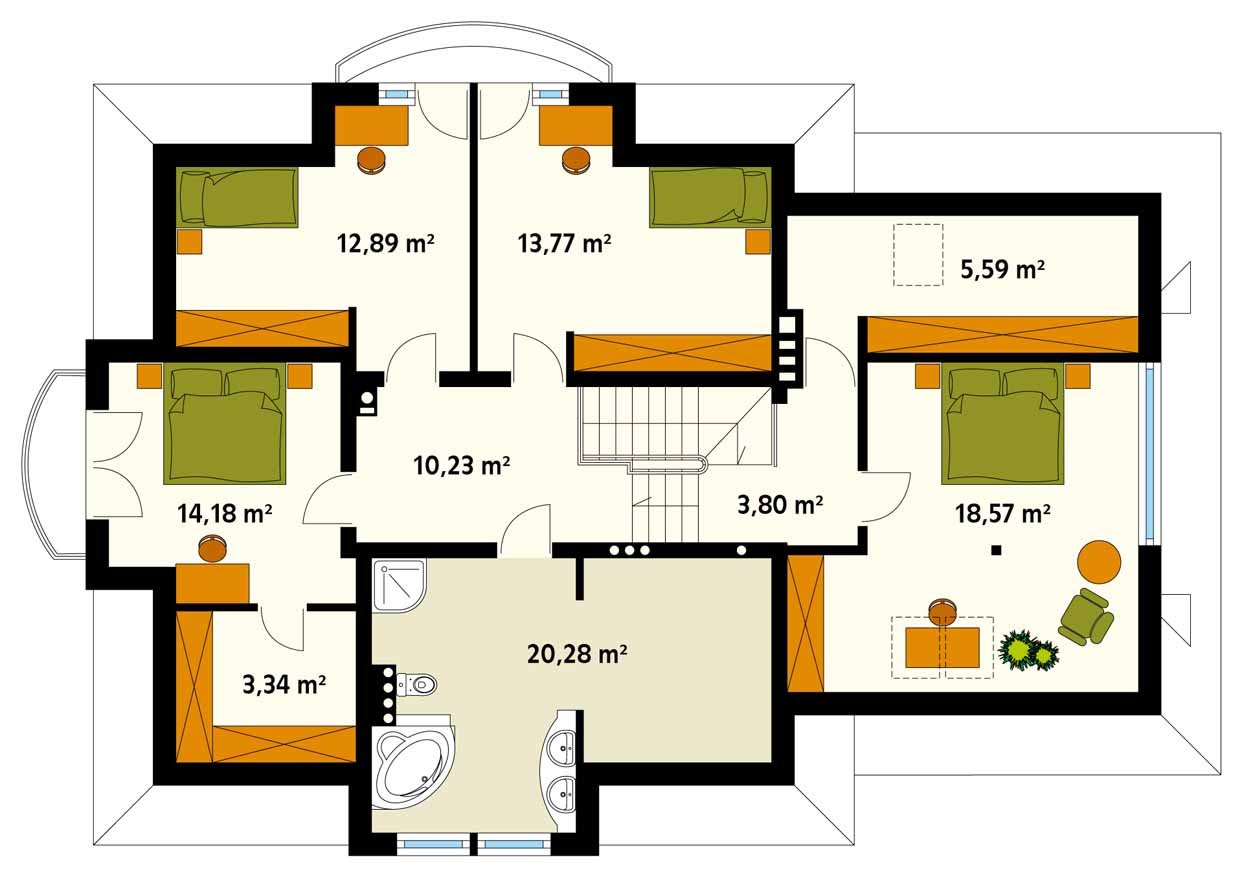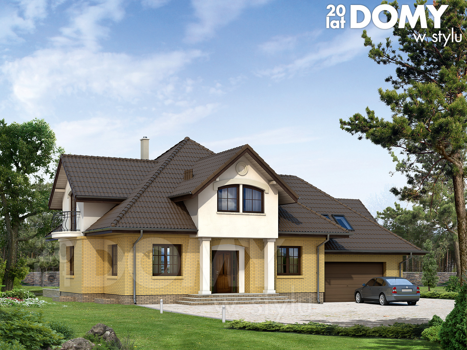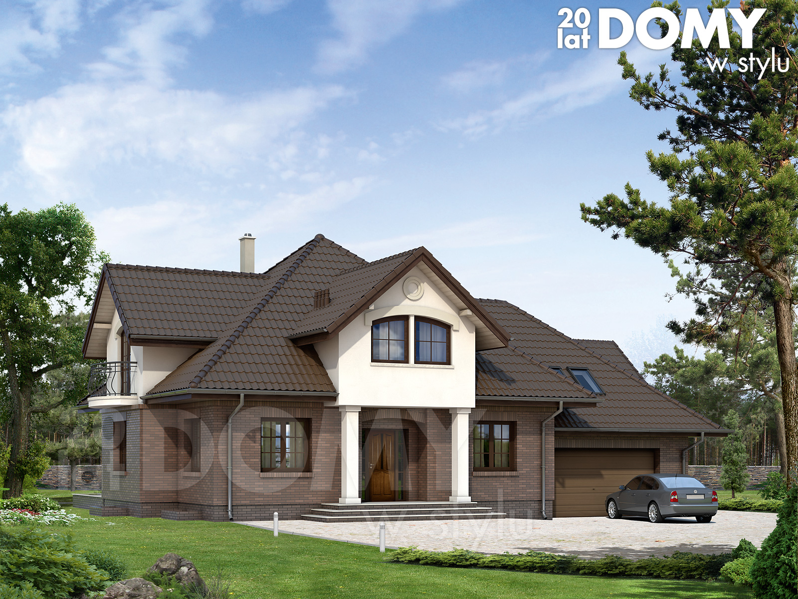 Dom jednorodzinny z użytkowym poddaszem, podpiwniczony z dwustanowiskowym garażem. Na parterze znajduje się przestronna część dzienna.Na poddaszu zlokalizowano cztery sypialnie, łazienkę i garderoby. Piwnica mieści pomieszczenia gospodarcze: kotłownię, skład opału, pralnię, spiżarnię oraz duże pomieszczenie rekreacyjne. Wygodny dom o tradycyjnej bryle przeznaczony dla 5-osobowej rodziny.