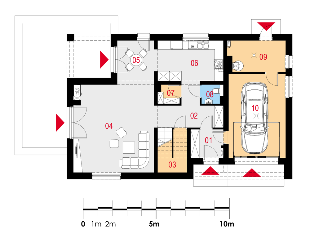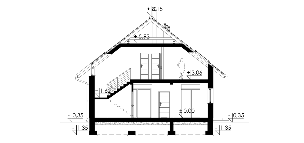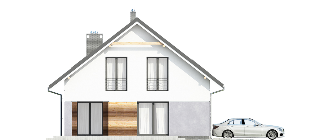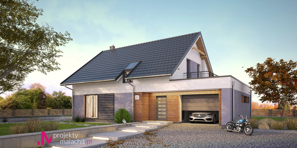 Nowoczesny dom jednorodzinny z dachem dwuspadowym, wolnostojący, niepodpiwniczony z poddaszem użytkowym i garażem. Nad garażem dach płaski, wykorzystany częściowo na taras. Na układ funkcjonalny składają się pokój dzienny z wyjściem na taras, jadalnia z wyjściem na taras, kuchnia, spiżarka, cztery pokoje, łazienka, WC, garderoba, garaż, pralnia, pomieszczenie gospodarcze, schowek pod schodami. Duży taras również nad częścią garażową budynku.