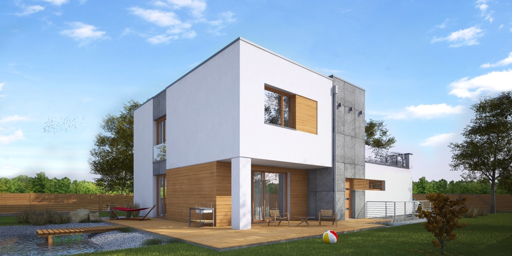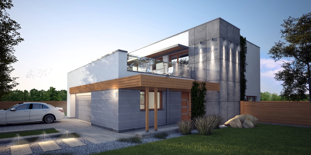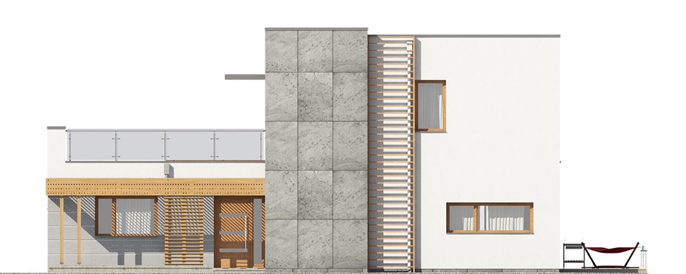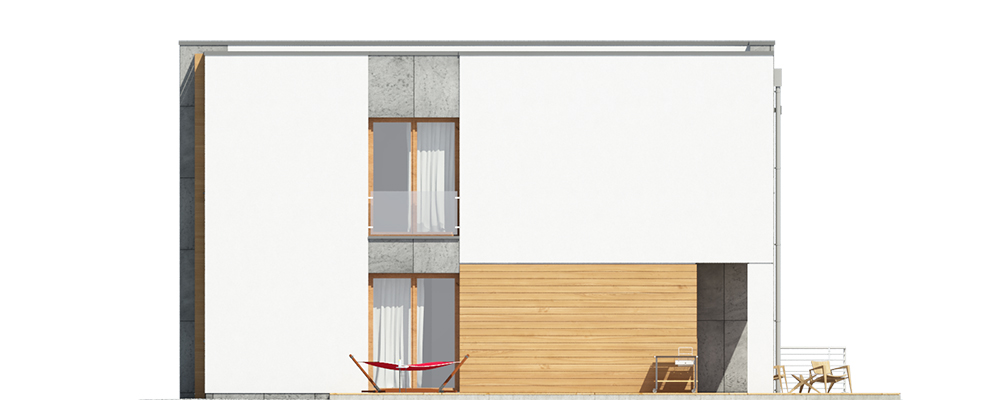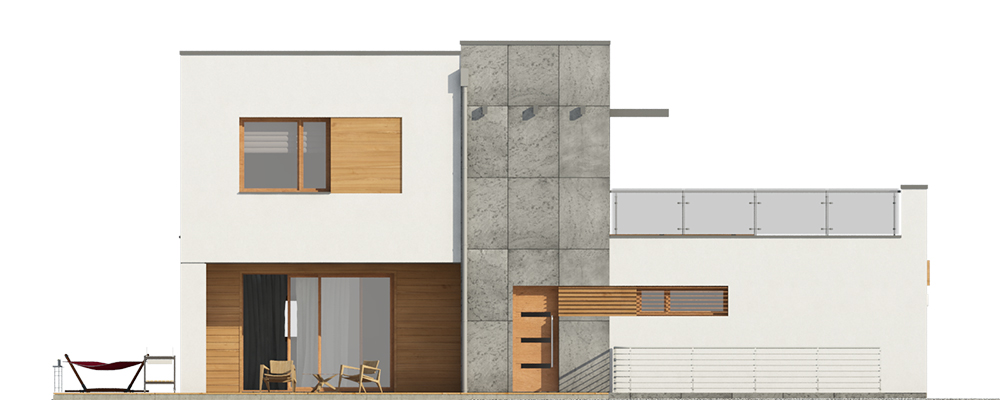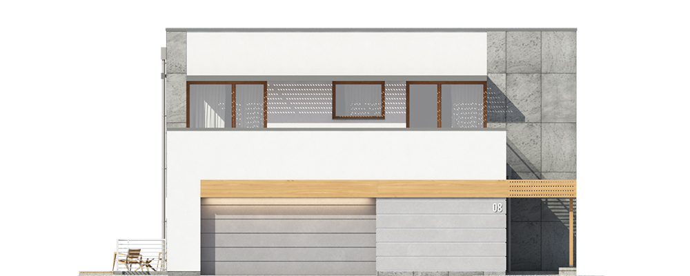 Nowoczesny piętrowy dom jednorodzinny z dachem płaskim, wolnostojący, podpiwniczony, dwukondygnacyjny z dużym garażem dwustanowiskowym. Na układ funkcjonalny składają się salon z wyjściem na taras, kuchnia z jadalnią, cztery pokoje, dwie łazienki, garderoba, garaż, cztery pomieszczenia gospodarcze w piwnicy, jedno na parterze oraz jedno na piętrze. Na parterze pokój może pełnić funkcję gabinetu usługowego. Nad częścią garażową przestronny taras.