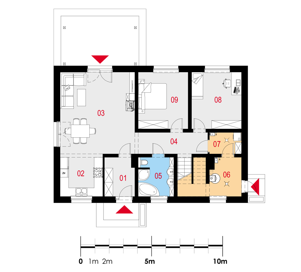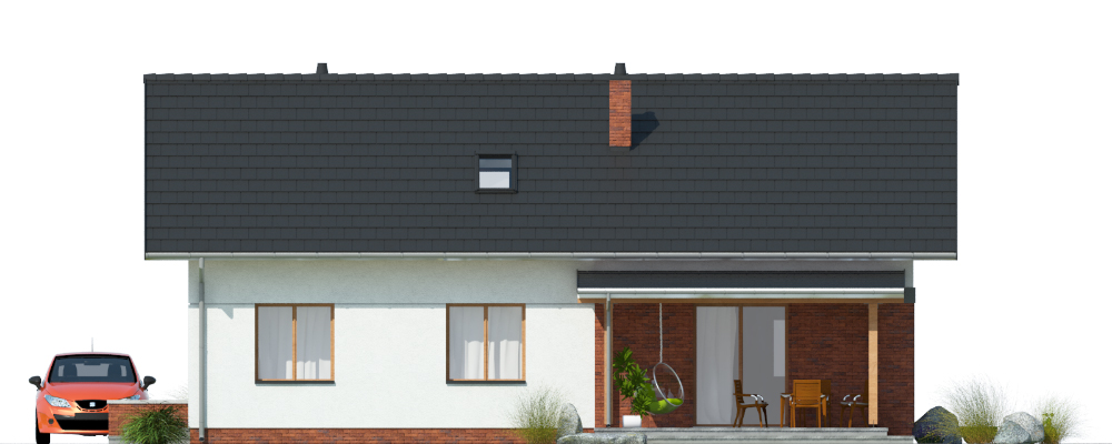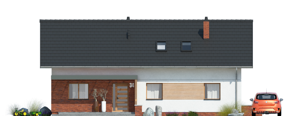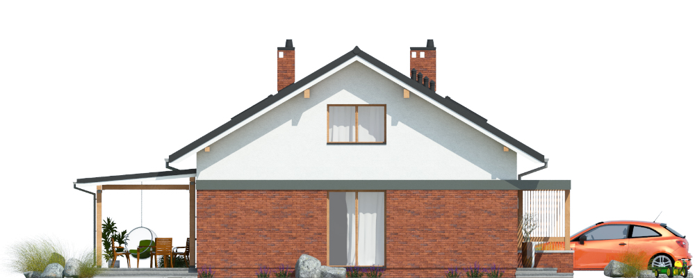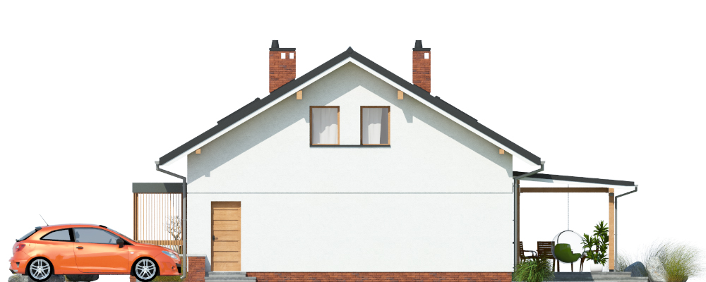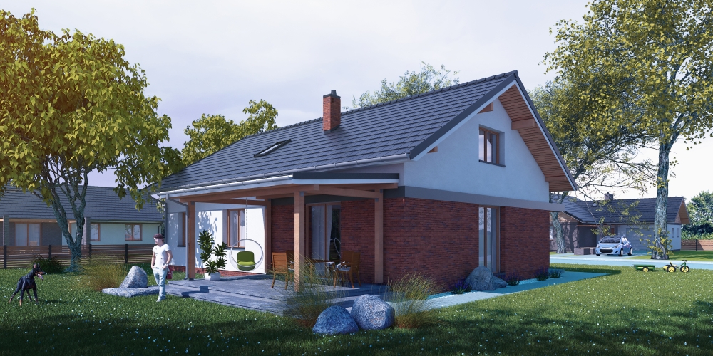 Dom jednorodzinny, wolnostojący, z poddaszem nieużytkowym. Na układ funkcjonalny składają się salon z jadalnią i wyjściem na taras, 2 pokoje, kuchnia, łazienka, pralnia, korytarz z klatką schodową, pomieszczenie gospodarcze.