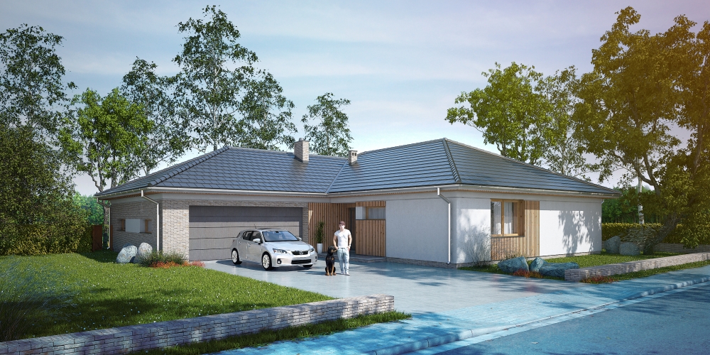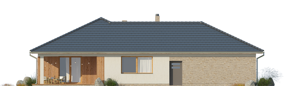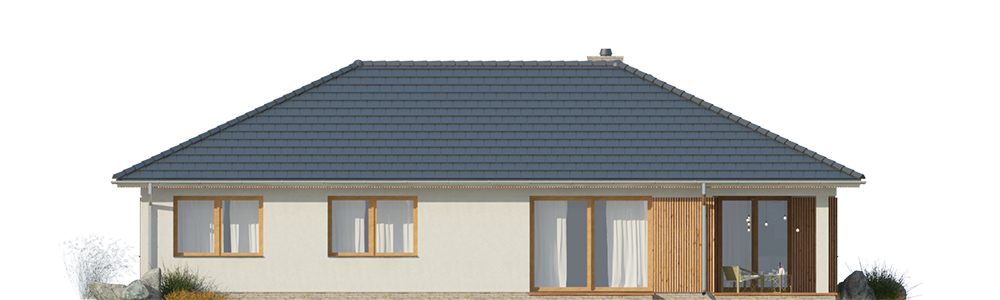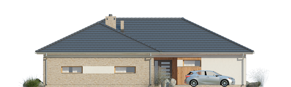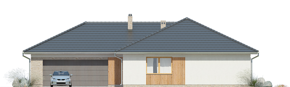 Prosty dom jednorodzinny, wolnostojący, z poddaszem nieużytkowym, dachem czterospadowym-kopertowym i garażem dwustanowiskowym. Na układ funkcjonalny składają się pokój dzienny z wyjściem na taras, kuchnia z jadalnią i wyjściem na taras, trzy pokoje, dwie łazienki, spiżarnia, garaż, pomieszczenie gospodarcze.