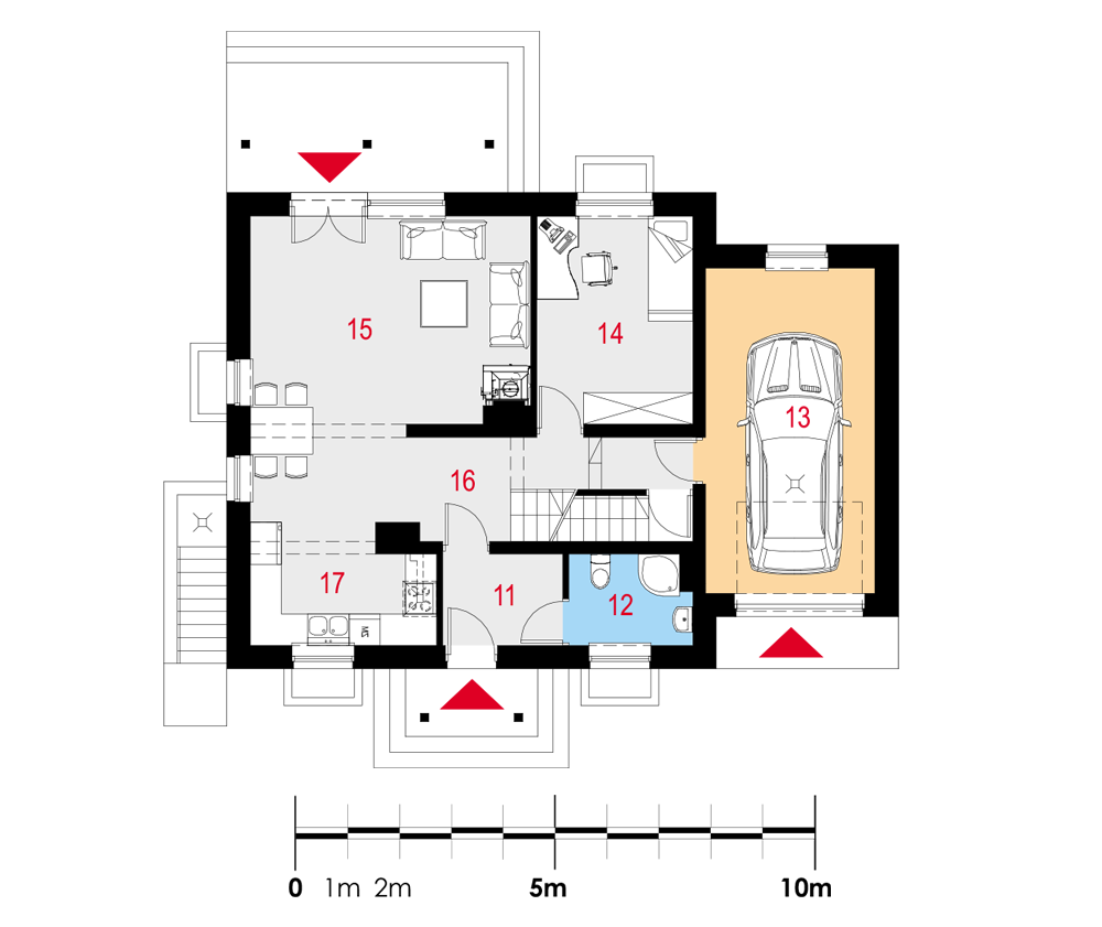Dom jednorodzinny, wolnostojący, częściowo podpiwniczony, z poddaszem użytkowym i garażem  jednostanowiskowym. Na układ funkcjonalny składają się salon z jadalnią i wyjściem na taras, 5 pokoi, kuchnia, 2 łazienki, garderoba, garaż, pralnia z suszarnią, 3 pomieszczenia gospodarcze.