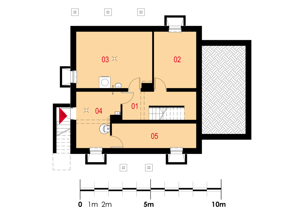 Dom jednorodzinny, wolnostojący, częściowo podpiwniczony, z poddaszem użytkowym i garażem jednostanowiskowym. Na układ funkcjonalny składają się salon z jadalnią i wyjściem na taras, 5 pokoi, kuchnia, 2 łazienki, garderoba, garaż, pralnia z suszarnią, 3 pomieszczenia gospodarcze.