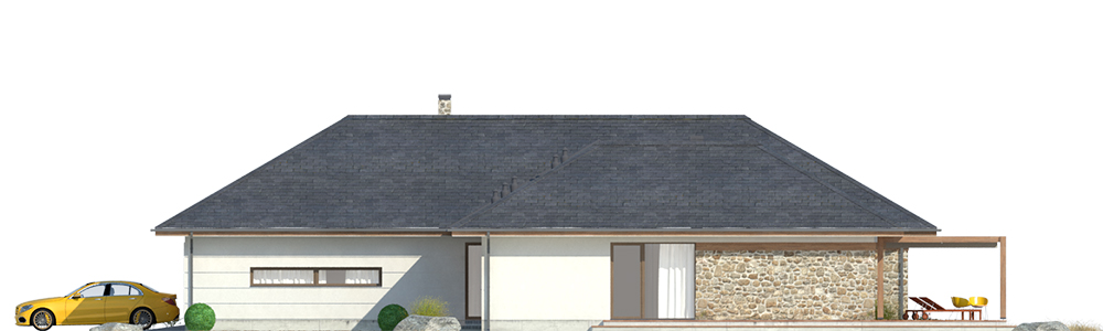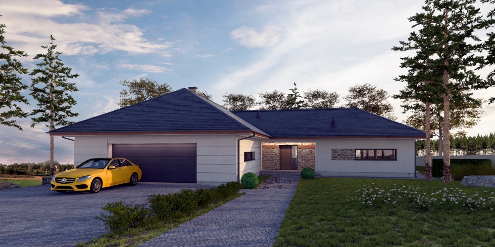 Nowoczesny parterowy dom jednorodzinny z dachem spadzistym, wolnostojący, niepodpiwniczony z dużym garażem dwustanowiskowym w którym strefa dzienna została wyraźnie oddzielona od strefy nocnej. Na układ funkcjonalny składają się pokój dzienny, jadalnia, kuchnia, spiżarka, cztery pokoje, dwie łazienki, trzy garderoby, schowek, pomieszczenie gospodarcze, garaż.