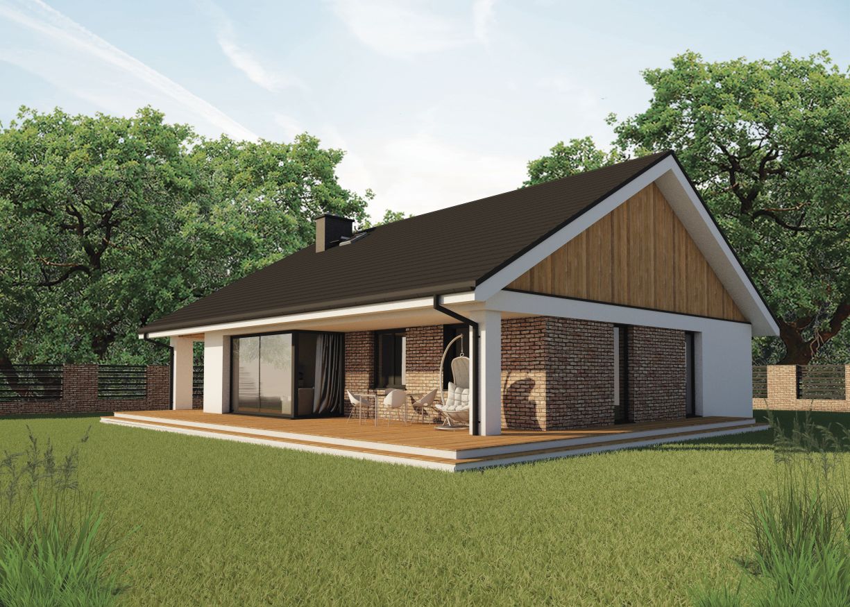 KOMODO to przytulny, bardzo funkcjonalny dom parterowy o niewielkich wymiarach i prostej konstrukcji. Elewacja pokryta jest płytkami z cegły. Dopełniają ja białe, tynkowane powierzchnie. Szczyt domu wypełnia okładzina z desek. Ciemny dach wieńczy całość bryły a duże przeszklenia dodają jej nowoczesności.