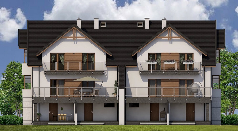 QUATTRO Z GARAŻAMI to propozycja, która z pewnością zainteresuje Deweloperów oraz sprawdzi się w realizacji na terenach, gdzie nie ma możliwości zabudowy wielorodzinnej, ponieważ formalnie są to dwa budynki mieszkalne jednorodzinne w zabudowie bliźniaczej dające w sumie cztery niezależne lokale mieszkalne.