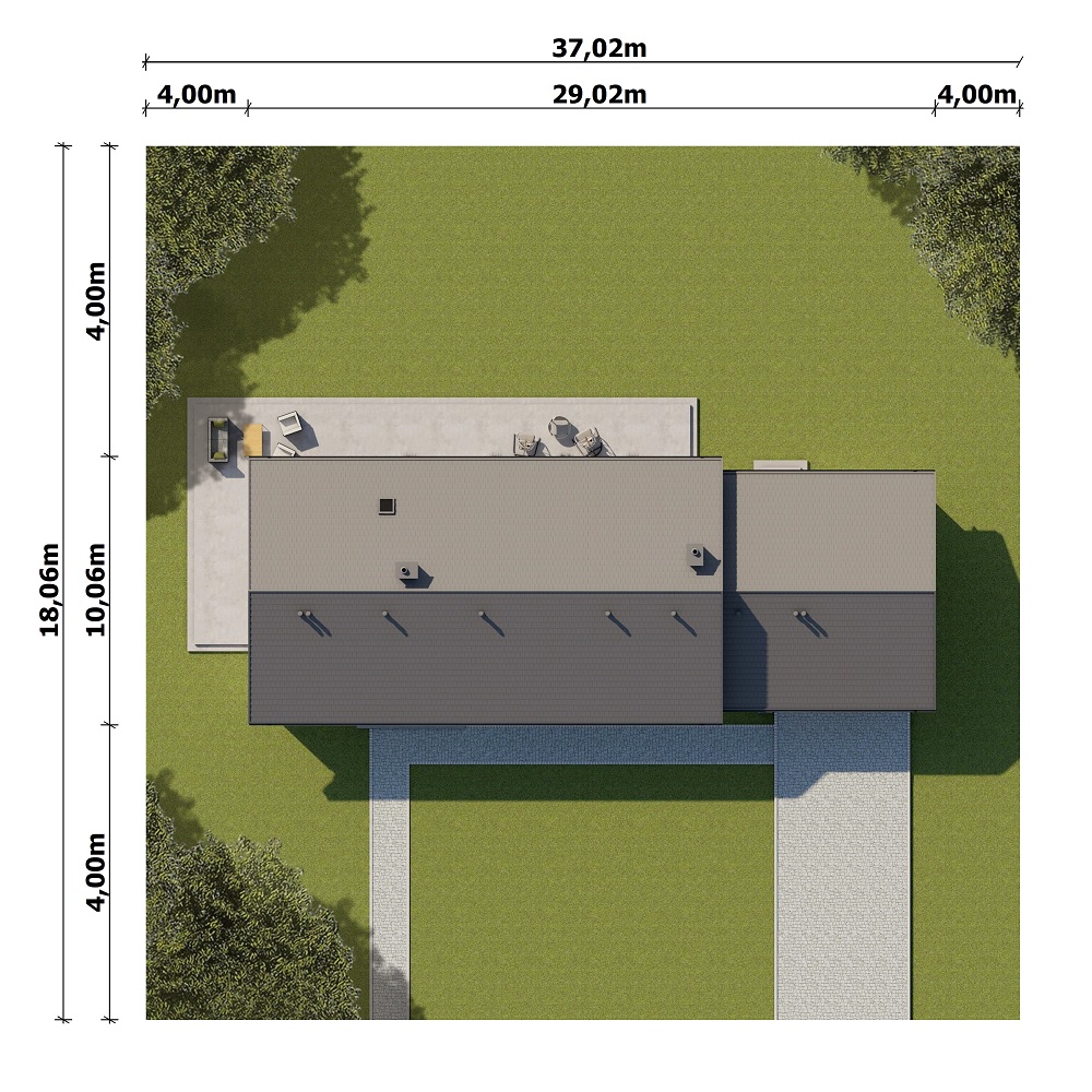 Dom zaplanowano tak, aby zapewnił maksymalny komfort użytkowania ale również był ekonomiczny w budowie, stąd właśnie proponuje się podłużną bryłę przekrytą dwuspadowym dachem, w konstrukcji z prefabrykowanych wiązarów drewnianych. Dzięki temu zabiegowi, dom można wybudować też znacznie szybciej.