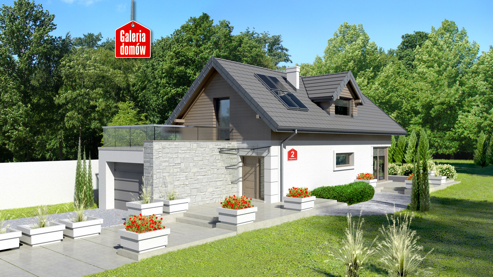 Zrobić coś dużego z czegoś małego? Sztuka! To bycie zaradnym i kreatywnym. Podobnie jak zbudowanie fajnego domu na dość wąskiej działce. Zobaczcie, jak to zrobiliśmy: pokój dzienny wychodzi na wschód, ale jest doświetlony przez duże, narożne okno. Garaż i taras na tak małej przestrzeni? Nie ma problemu - taras znajduje się na dachu garażu, dzięki czemu znikają drogie koszty zadaszenia. Można za to delektować się słońcem i świeżą kawą pitą pod chmurką. Dodatkowe ciepło zapewniają kolektory słoneczne zamontowane na dachu. Dla tych, którzy lubią zjeść, wygospodarowaliśmy miejsce na spiżarnię, garderobę i pralnię. Garaż częściowo obity kamieniem, poddasze – elegancką drewnianą okładziną w brązowym kolorze. Trochę praktycyzmu, szczypta wyobraźni i voila!