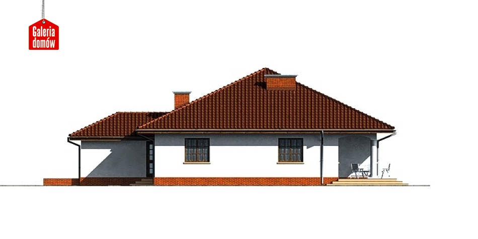 Dom przy Ogrodowej to projekt gotowy domu parterowego z jednostanowiskowym garażem. Klasyczna bryła na bazie kwadratu urozmaicona została poprzez wprowadzenie podcieni przy wejściu oraz od strony pokoju dziennego oraz wypuszczenie garażu. Logicznie zaprojektowany układ pomieszczeń dzieli budynek na dwie strefy: dzienną i sypialną. Część nocna to cztery pokoje oraz duża łazienka. Strefa dzienna to funkcjonalne połączenie pokoju dziennego, kuchni oraz spiżarni.