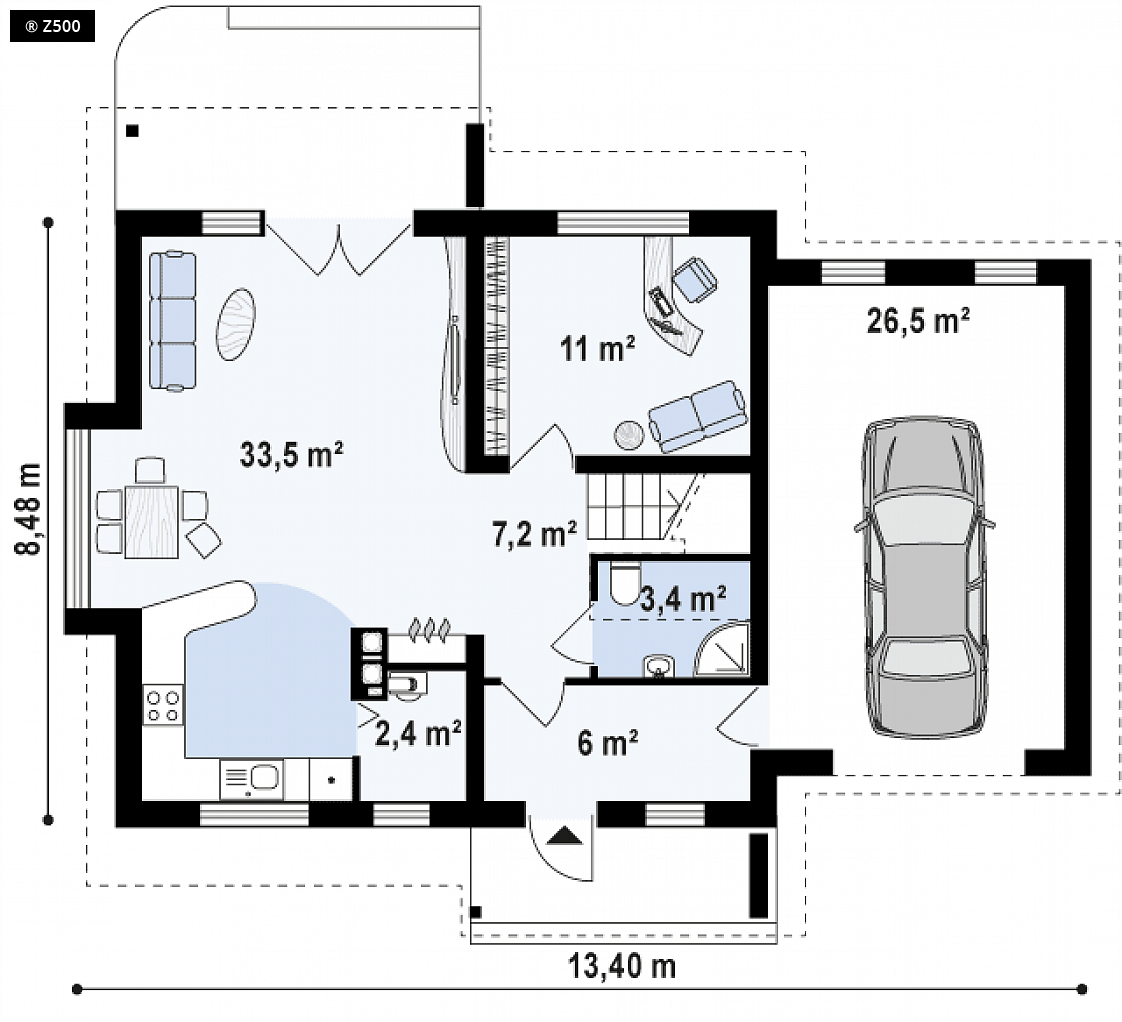 Projekt Z102 to projekt funkcjonalnego i taniego w budowie domu.Prosta konstrukcja oraz dach dwuspadowy pozwoli zaoszczędzić pieniądze. Wnętrze domu to część dzienna: duży i jasny salon, jadalnia oraz kuchnia, komunikacja oraz część do pracy i wypoczynku domowników. W dużej sieni można wydzielić ścianką odrębną garderobę bądź wstawić pojemną szafę na kurtki, płaszcze i buty. Spokojnie można umieścić wygodny fotel oraz duże lustro aby zapewnić sobie komfort ubierania. Kominek ustawiony w sercu domu jest widoczny z każdego miejsca w salonie jak i z jadalni. Kuchnia otwiera się na salon, łącząc obie przestrzenie. Na parterze znajduje się dodatkowy pokój, który może służyć jako pokój gościnny bądź gabinet do pracy oraz garaż z którego można przejść bezpośrednio do domu. Poddasze to strefa nocna dla mieszkańców, gdzie znajdują się 3 wygodne sypialnie oraz rodzinna łazienka z pralnią. W domu z102 życie kwitnie w jego wnętrzu jak i na zewnątrz, w pięknie urządzonym ogrodzie. Tras od strony salonu jest zadaszony wysuniętym fragmentem dachu, gdzie można urządzać grillowe imprezki w każdą pogodę.