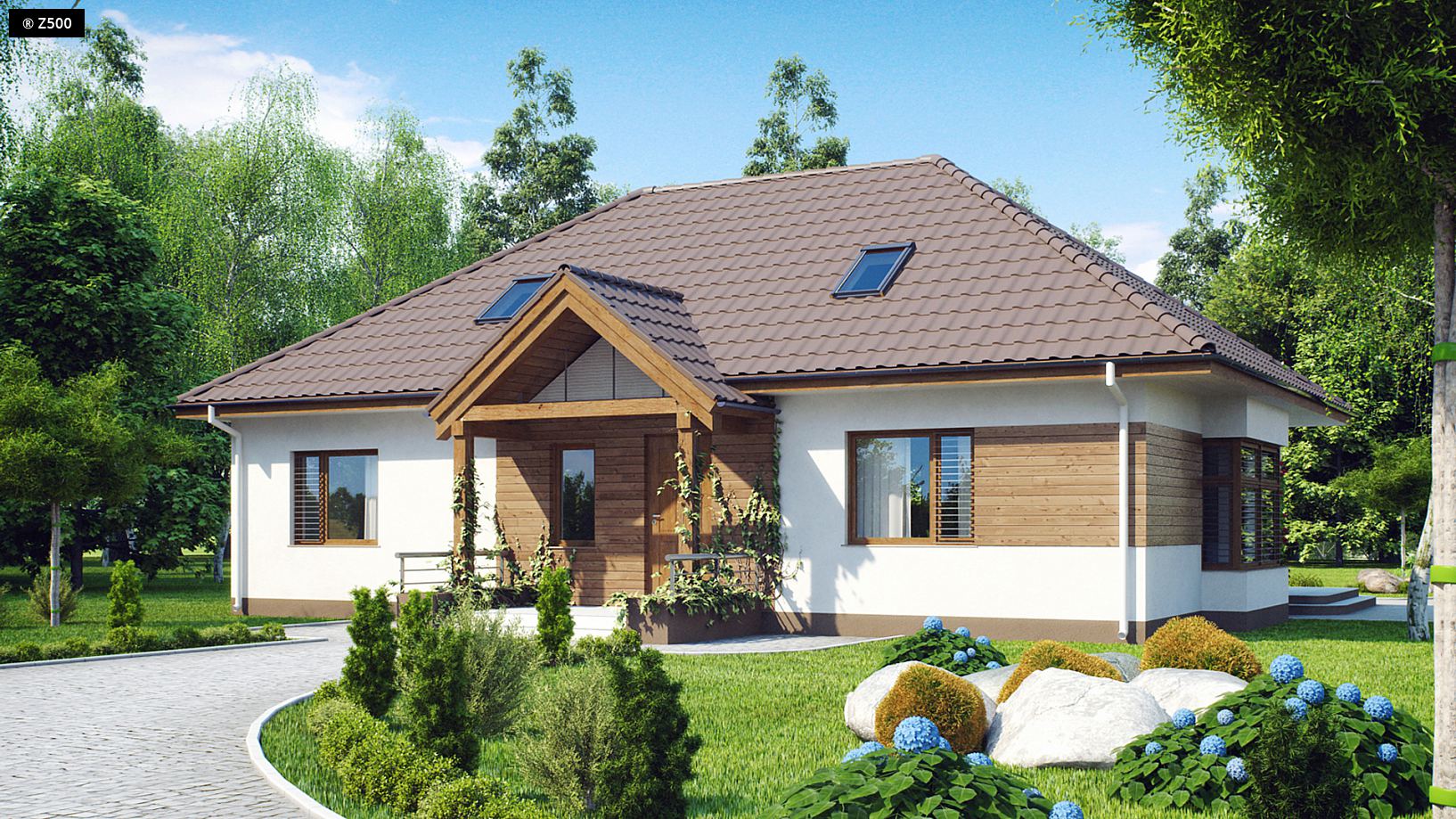 Z106 to projekt domu parterowego o estetycznym wyglądzie i komfortowym wnętrzu. Prosta, zgrabna bryła, wysunięty daszek na słupkach, wykończenie elewacji naturalnymi materiałami oraz kopertowy dach nadają mu stylu dawnych dworków szlacheckich. Centralnie umieszczona obszerna sień z miejscem na pojemną szafę, dzieli dom na 2 strefy. Część dzienna to przestronny, jasny salon połączony z kuchnią oraz jadalnią w przeszklonym wykuszu. Duży, częściowo zadaszony taras z widokiem na ogród to idealne miejsce odpoczynku. W lewym skrzydle domu wydzielono część nocną. Są tu trzy wygodne sypialnie oraz łazienka. Dodatkowo zaprojektowane zostały: podręczna spiżarka, pralnia, pomieszczenie gospodarcze oraz wc z prysznicem i niewielkim oknem. Projekt domu Z106 to projekt dla ludzi ceniących sobie klasykę z nutką nowoczesnych rozwiązań. Dom ujmuje swą naturalnością i delikatnością. Jest idealnym połączeniem architektury XX wieku z dzisiejszymi trendami.
