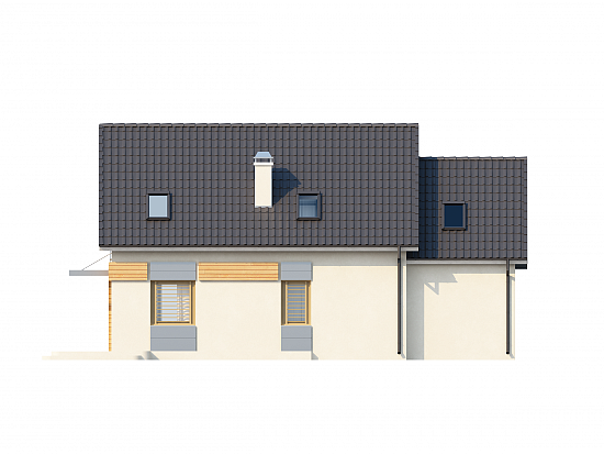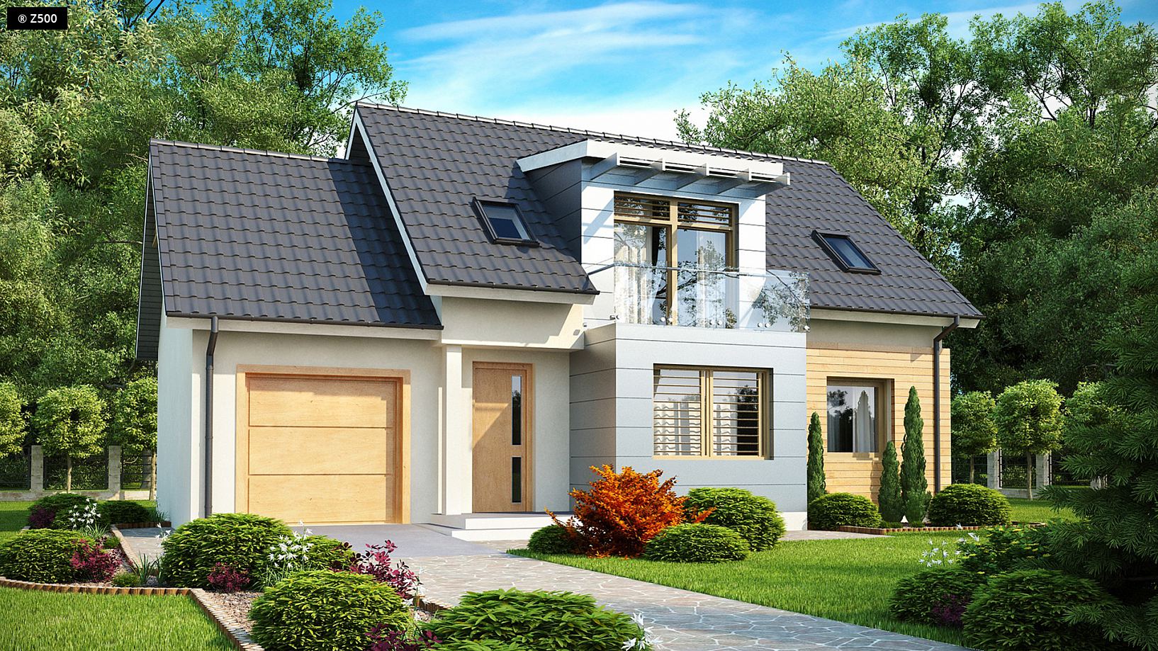 Z126 to zgrabny dom jednorodzinny z poddaszem użytkowym oraz bocznym garażem, zaprojektowany dla 5,6-osobowej rodziny. Elewacje utrzymane w jasnej, stonowanej kolorystyce wraz z nowoczesnymi elementami wykończenia nadają mu nowoczesnego wyglądu. Wyjątkowy charakter podkreśla ciekawy wykusz wykończony szarą blachą. W wysuniętej przed front części zaplanowano przestronną kuchnię z oknem skierowanym na strefę wejściową. Otwarta część dzienna z kominkiem łączy salon, jadalnię. Dla większego komfortu kuchnię można całkowicie wydzielić. Z salonu prowadzi wyjście na duży, zadaszony taras. Na parterze znalazły również miejsce: pomieszczenie gospodarcze, kotłownia, spore wc z prysznicem. Do części nocnej na poddaszu prowadzą wygodne schody ze spocznikiem. Zaprojektowano tu cztery komfortowe pokoje oraz ogólnodostępną łazienkę. Sypialnia nad garażem posiada własną pojemną garderobę. Do głównej sypialni przynależy niewielki taras nad wykuszem.