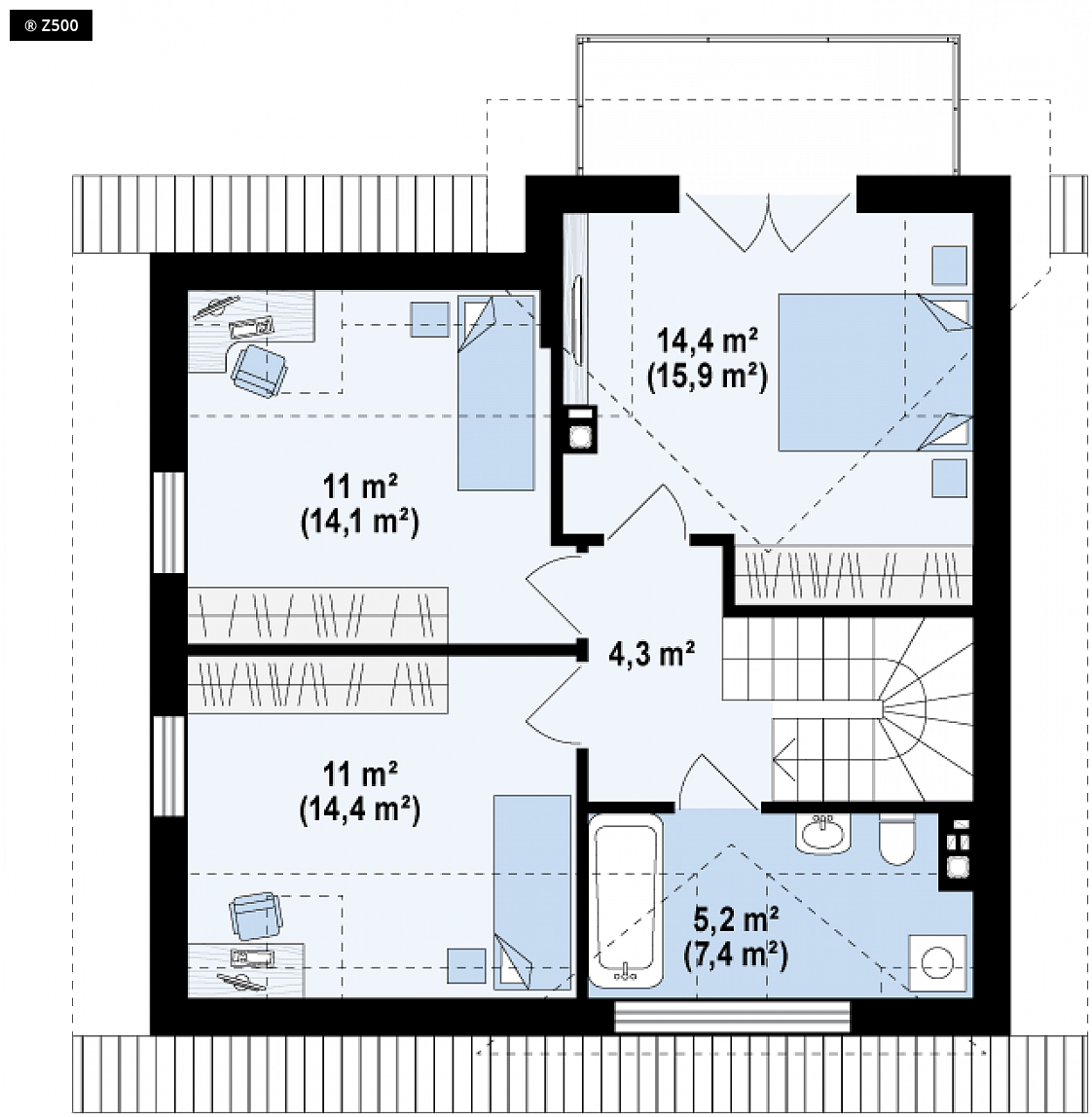 Z163 to mały i funkcjonalny dom z dwuspadowym dachem. Prosta bryłę urozmaica zgrabny wykusz od strony ogrodu oraz lukarna nad wejściem. Ciekawe elementy wykończenia elewacji oraz forma zadaszenia nadają mu elegancji i nowoczesnego stylu. Parter to przestronna część dzienna wyraźnie podzielona na 3 strefy - spora kuchnia ze spiżarką, przestronna jadalnia z wyjściem na zadaszony taras oraz wygodny salon z centralnie ulokowanym kominkiem. Pod schodami znajduje się wc, a pojemna szafa w sieni pomieści odzież wierzchnią oraz obuwie domowników. Na poddaszu znajdują się trzy pokoje. Dwie niemal bliźniacze sypialnie posiadają podobna powierzchnię. Nieco większa jest główna sypialnia rodziców zaprojektowana z wykuszem i wygodnym wyjściem na balkon. Ogólnodostępną łazienkę doświetla nowoczesne w formie, trójkątne okno. Z163 to kompaktowy dom, idealny dla 3-4 osobowej rodziny. Jego funkcjonalność, prosta bryła ubrana w nowoczesne dodatki z pewnością urzeknie wielu inwestorów.