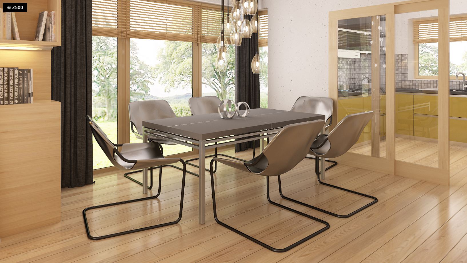 Wnętrze domu jest podzielone na dwie części: dzienną i nocną. Strefę dzienną tworzy przestronny salon z dużymi przeszkleniami, i jadalnia. Stąd jest także bezpośrednie przejście do kuchni, która może zostać oddzielona od salonu za pomocą suwanych drzwi. Lewa część domu to strefa nocna. Znajduje się tu łazienka i trzy sypialnie, w tym jedna z prywatnym wyjściem na zadaszony taras. Dodatkowym atutem jest bezpośredni dostęp z domu do dwustanowiskowego garażu. W holu przewidziane zostało miejsce na schody klapowe na strych. Dom Z200 można ogrzewać na wiele sposobów począwszy od nowoczesnych ekokominków na pelety, jak również węglem czy gazem. Pozwala na to pomieszczenie gospodarcze dostępne z garażu.