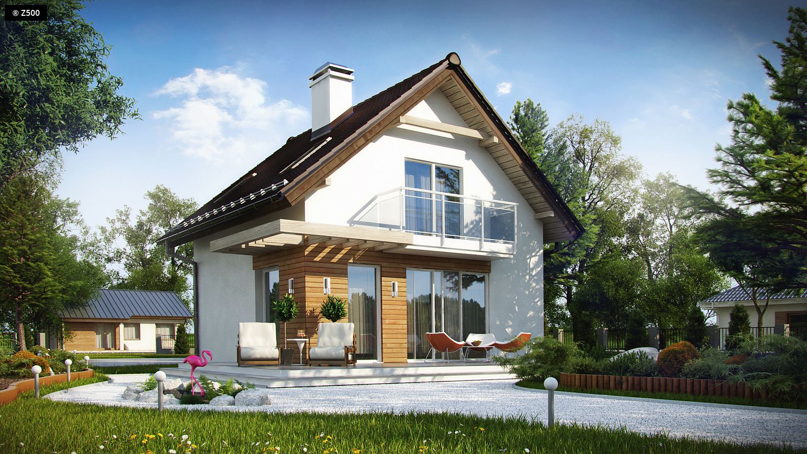 Z264 to projekt domu z poddaszem użytkowym i dwuspadowym dachem. Zwarta, prosta bryła wzbogacona drewnem na elewacji powoduje, że budynek nabrał ciekawego i nowoczesnego wyglądu. Parter to strefa dzienna domu, stanowi go przede wszystkim salon z kominkiem oraz wyjściem na taras. Salon połączony został jednoprzestrzennie z jadalnią. Zlokalizowano tu również sporą kuchnie otwartą na jadalnię, sień z miejscem na szafy oraz niedużą łazienkę. Na piętrze znajduje się ogólnodostępna łazienka oraz dwie duże, wygodne sypialnie, w tym jedna z osobną garderobą i wyjściem na balkon. Z264 to praktyczny i funkcjonalny projekt domu. Stworzony został z rozwagą i dbałością o szczegóły dla osób poszukujących małego i taniego domu.