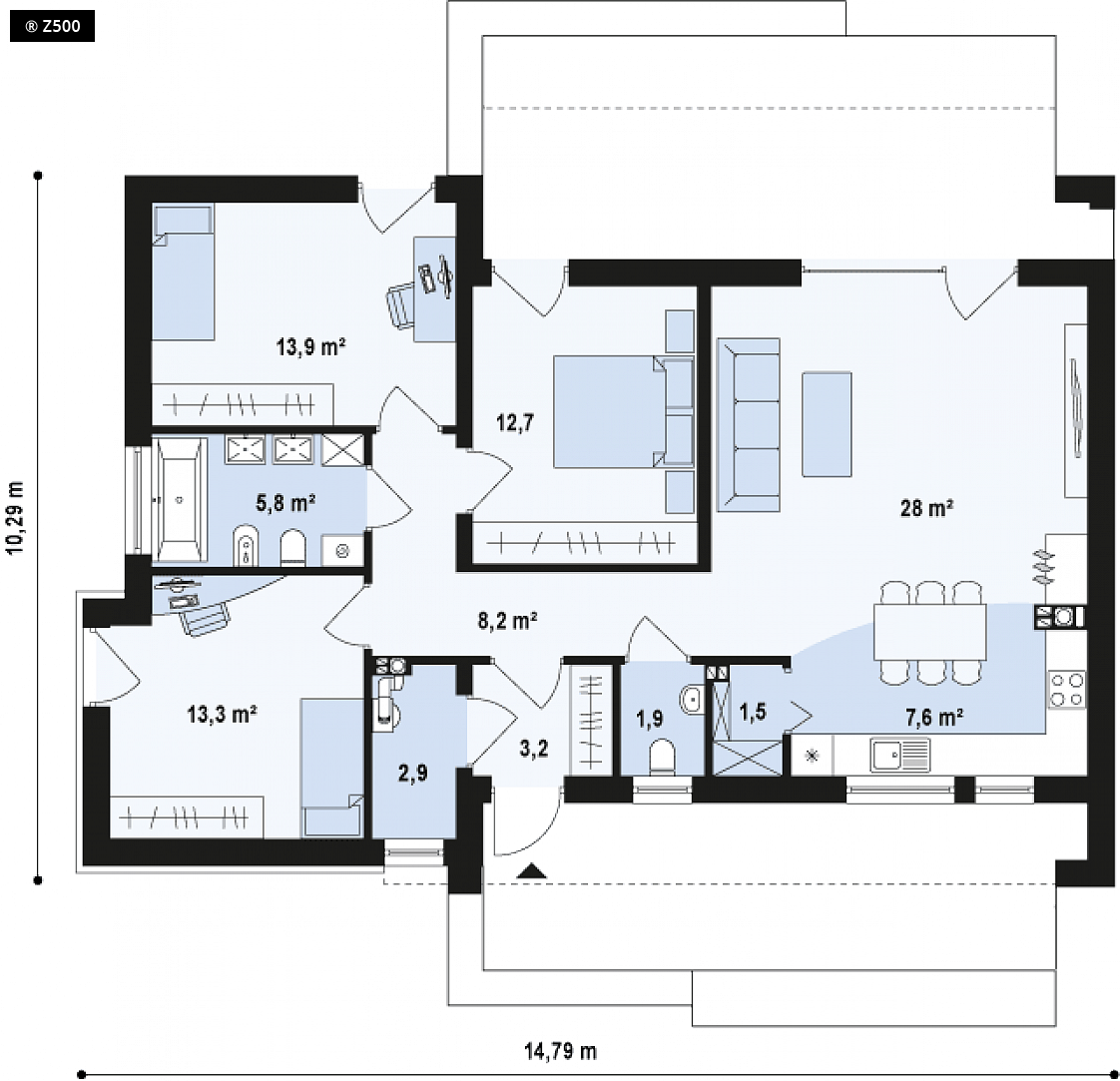 ZX53 to parterowy dom o zgrabnej, nowoczesnej bryle. Na niewielkiej powierzchni zaledwie 100 m2 oferuje bogaty program użytkowy z trzema sypialniami. Starannie dobrane elementy wykończenia elewacji oraz podcienie z pergolami podkreślają jego nowatorski charakter. Prosta konstrukcja pozwala na niemal dowolną aranżację wnętrza. Ścianki działowe można swobodnie przesuwać, likwidować. Strefa wypoczynku to przestronny salon połączony z otwartą kuchnią. Do kuchni przynależy podręczna spiżarka, obok znajduje się dodatkowe wc z oknem. W części nocnej zaplanowano 3 wygodne sypialnie, każda z dużym oknem balkonowym oraz komfortową łazienkę. Z salonu oraz sypialni gospodarzy jest bezpośrednie wyjście na zadaszony taras. Zx53 to propozycja dla osób ceniących prosty, wysmakowany minimalizm oraz funkcjonalność. Projekt pokazuje, że nowoczesny dom wcale nie musi oznaczać obszernej i kosztownej inwestycji.