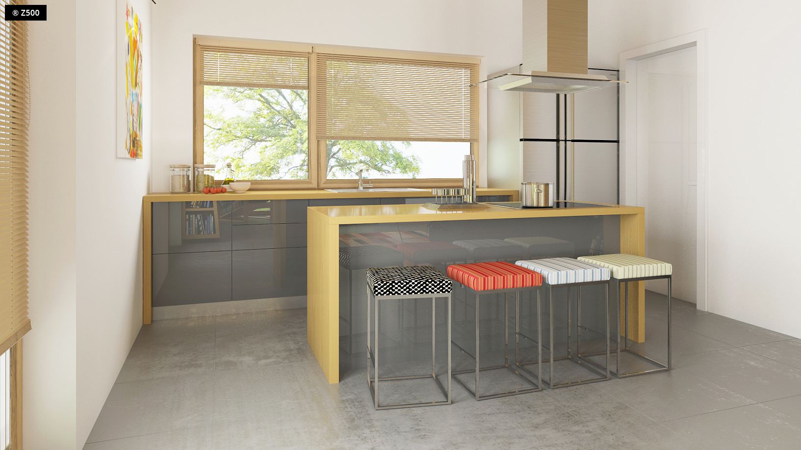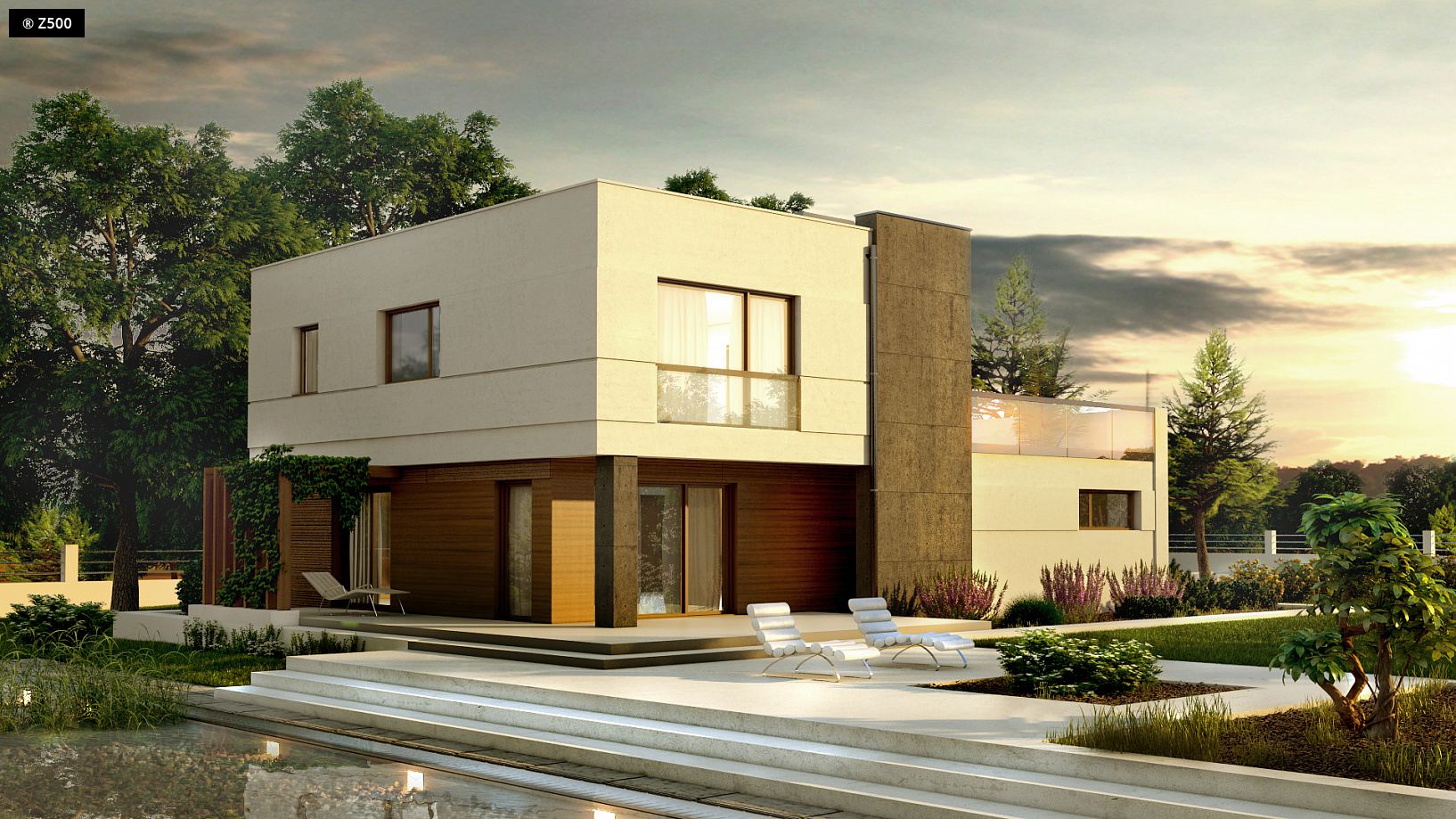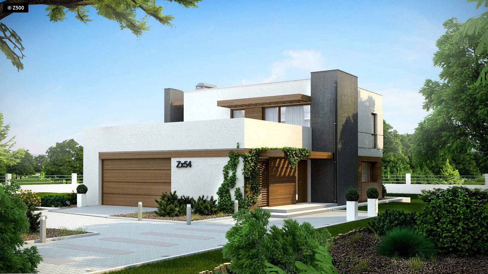 Zx54 to funkcjonalny piętrowy dom w nowoczesnym stylu. Ciekawe elementy wykończenia elewacji nadają mu wyjątkowego charakteru. Projekt wyróżnia obszerny taras nad garażem, dostępny zarówno z poziomu piętra jak i z ogrodu. Strefa dzienna to komfortowy salon połączony z kuchnią oraz jadalnią. Kuchnię zaprojektowano jako otwartą z modną wyspą na środku. Można ją łatwo oddzielić od pozostałych pomieszczeń ścianką działową. Stół w jadalni umiejscowiono przy dużym oknie balkonowym. Pozwoli to w ciepłe dni wygodnie przenieść posiłek na taras. Dodatkowo na parterze zaprojektowano gabinet z wejściem z sieni. Wygodne schody ze spocznikiem prowadzą do strefy nocnej. Znajdują się tam dwie niemal identyczne sypialnie oraz większy pokój dla gospodarzy z dużym oknem skierowanym na ogród. Ogólnodostępna łazienka posiada wyjście na taras, które umożliwi latem relaks w otoczeniu natury czy uprzyjemni proste czynności, jak pranie.