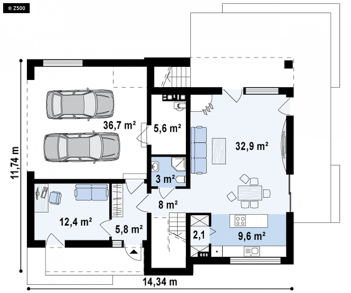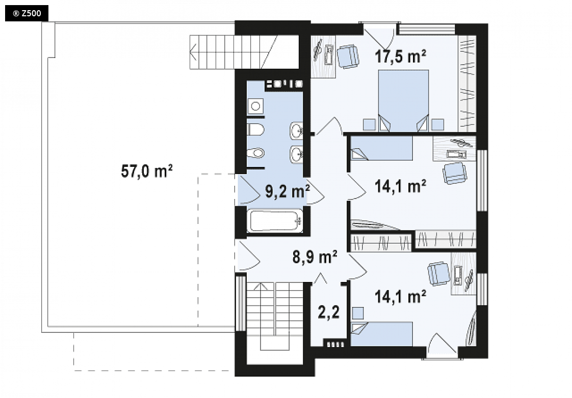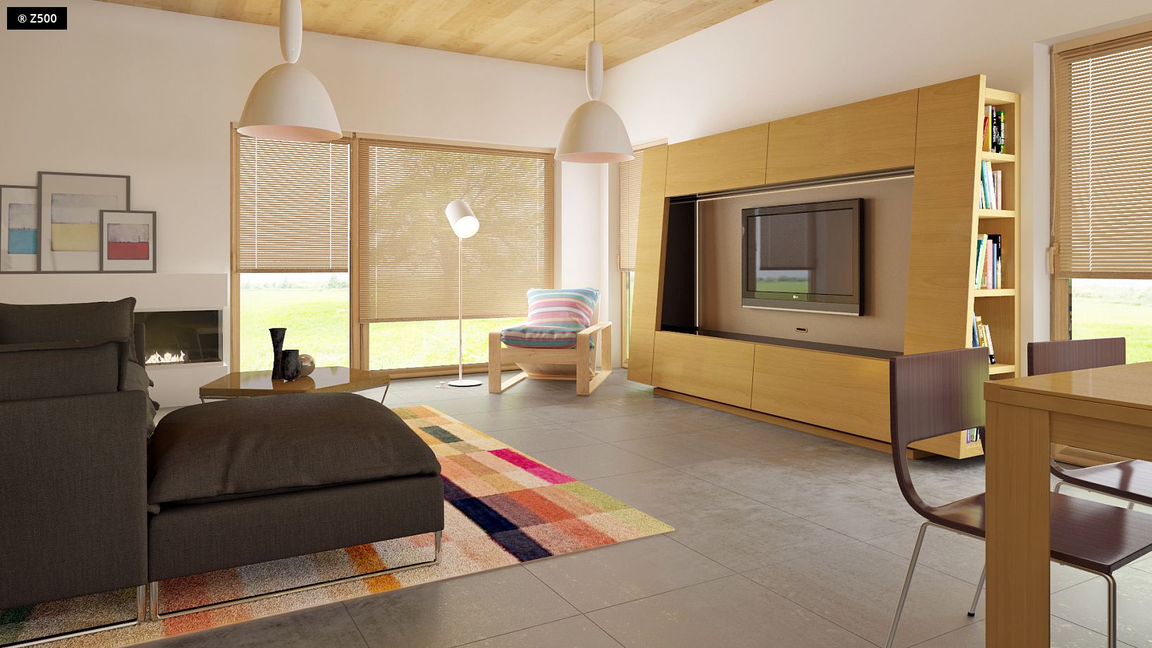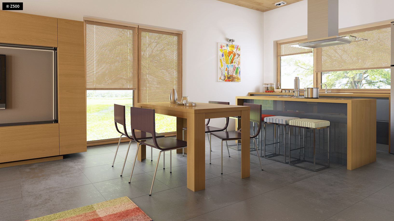 Zx54 to funkcjonalny piętrowy dom w nowoczesnym stylu. Ciekawe elementy wykończenia elewacji nadają mu wyjątkowego charakteru. Projekt wyróżnia obszerny taras nad garażem, dostępny zarówno z poziomu piętra jak i z ogrodu. Strefa dzienna to komfortowy salon połączony z kuchnią oraz jadalnią. Kuchnię zaprojektowano jako otwartą z modną wyspą na środku. Można ją łatwo oddzielić od pozostałych pomieszczeń ścianką działową. Stół w jadalni umiejscowiono przy dużym oknie balkonowym. Pozwoli to w ciepłe dni wygodnie przenieść posiłek na taras. Dodatkowo na parterze zaprojektowano gabinet z wejściem z sieni. Wygodne schody ze spocznikiem prowadzą do strefy nocnej. Znajdują się tam dwie niemal identyczne sypialnie oraz większy pokój dla gospodarzy z dużym oknem skierowanym na ogród. Ogólnodostępna łazienka posiada wyjście na taras, które umożliwi latem relaks w otoczeniu natury czy uprzyjemni proste czynności, jak pranie.