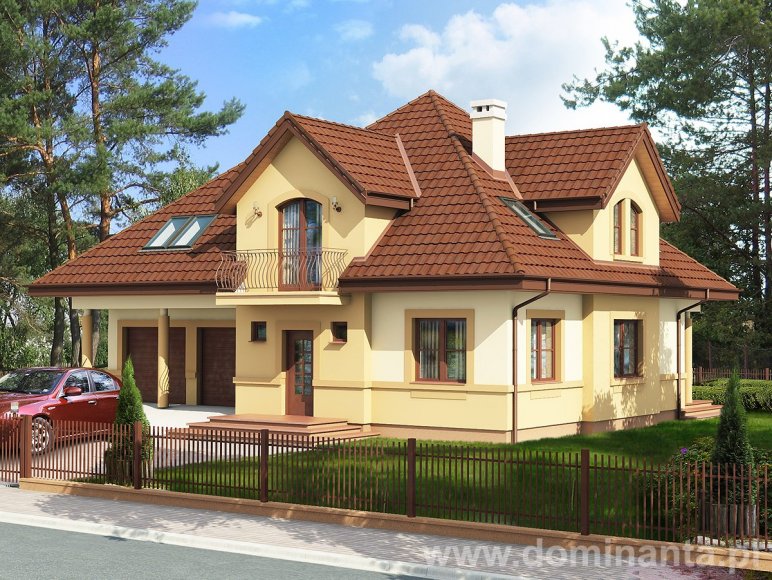 Jeśli posiadamy dużą działkę i potrzebujemy dwóch stanowisk w garażu, to projekt Faun 2G jest idealnym rozwiązaniem. Jest do wersja dwugarażowa projektu Faun. Bryła budynku jest bardzo urozmaicona – wejście do domu jest osadzone w delikatnym wykuszu; wykusz znajduje się także na bocznej ścianie, natomiast z tyłu domu gabinet oraz pomieszczenie techniczne również są wysunięte poza bryłę budynku. Zadaszony wjazd zdobią dwa filary. Poza tym poddasze wzbogacono o lukarny i balkon. Warto zwrócić uwagę na powiększoną powierzchnię poddasza. Sypialnia rodziców wyposażona została w garderobę i dużą indywidualną łazienkę oraz została połączona z gabinetem. Może więc tworzyć bardzo przestronną, zaciszną przystań dla małżeństwa.