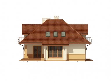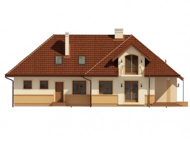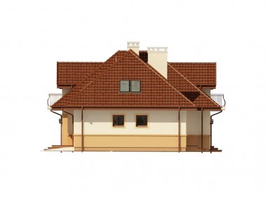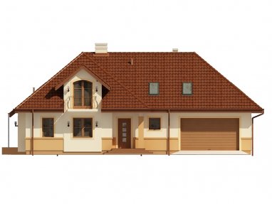 Szejk 2G to wersja projektu Szejk z garażem dwustanowiskowym. Jak sama nazwa wskazuje, projekt jest duży, rozłożysty, reprezentacyjny, pięknie prezentuje się na przestronnej działce. Ozdobą domu są lukarny, w których umieszczono balkony, wykusz, stanowiący idealne miejsce na jadalnię oraz kolumny, na których wsparty jest balkon nad wejściem i zadaszenie tarasu. Dom ten przeznaczony jest dla ludzi ceniących przestrzeń. Dodatkowe stanowisko w garażu umożliwiło powiększenie poddasza. Jedna z sypialni jest większa i wyposażona w oddzielną garderobę. Warto zwrócić uwagę na usytuowanie schodów – znajdują się tuż przy głównym wejściu, dzięki czemu nie zabierają cennego miejsca w centralnej części domu.