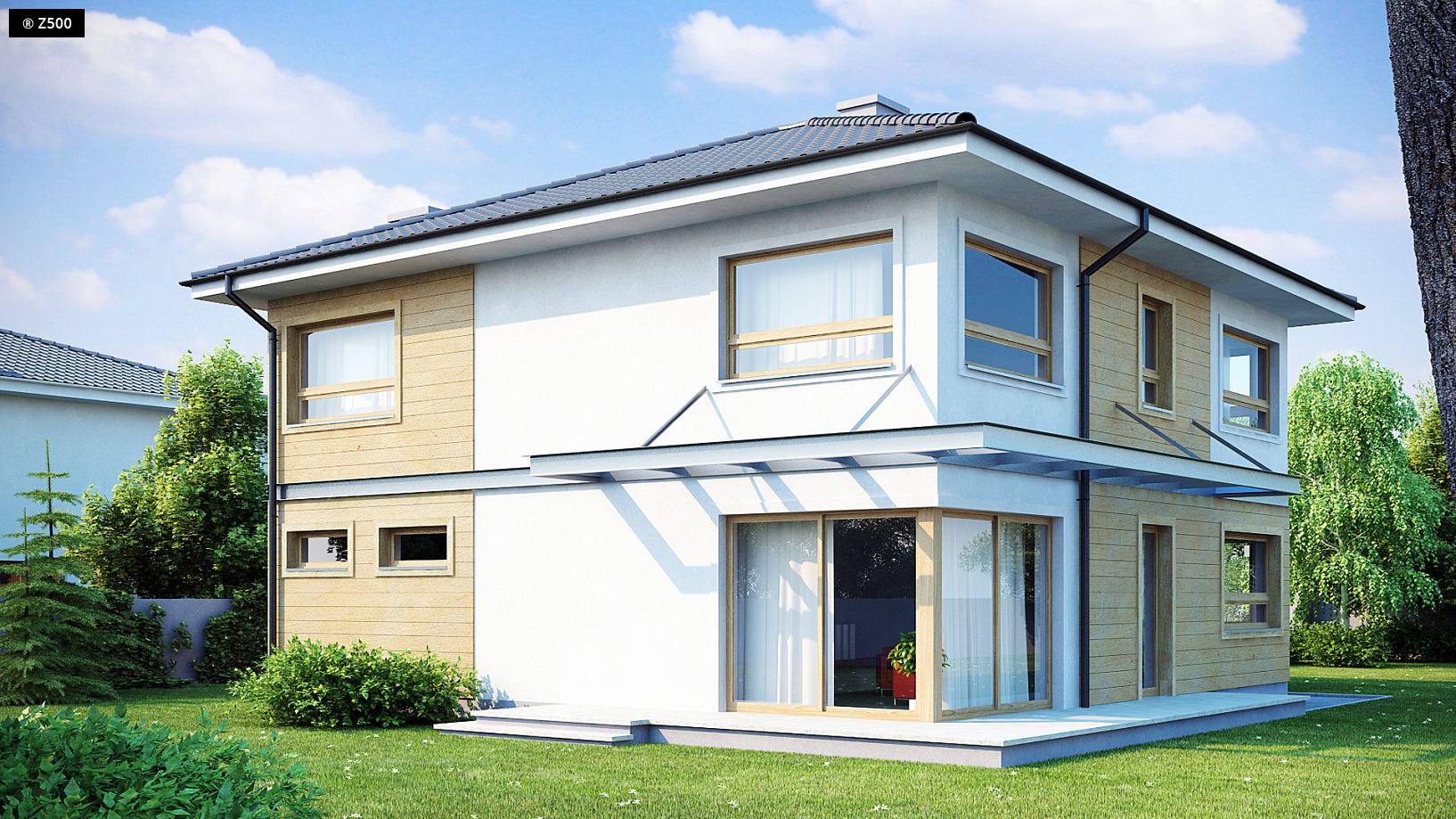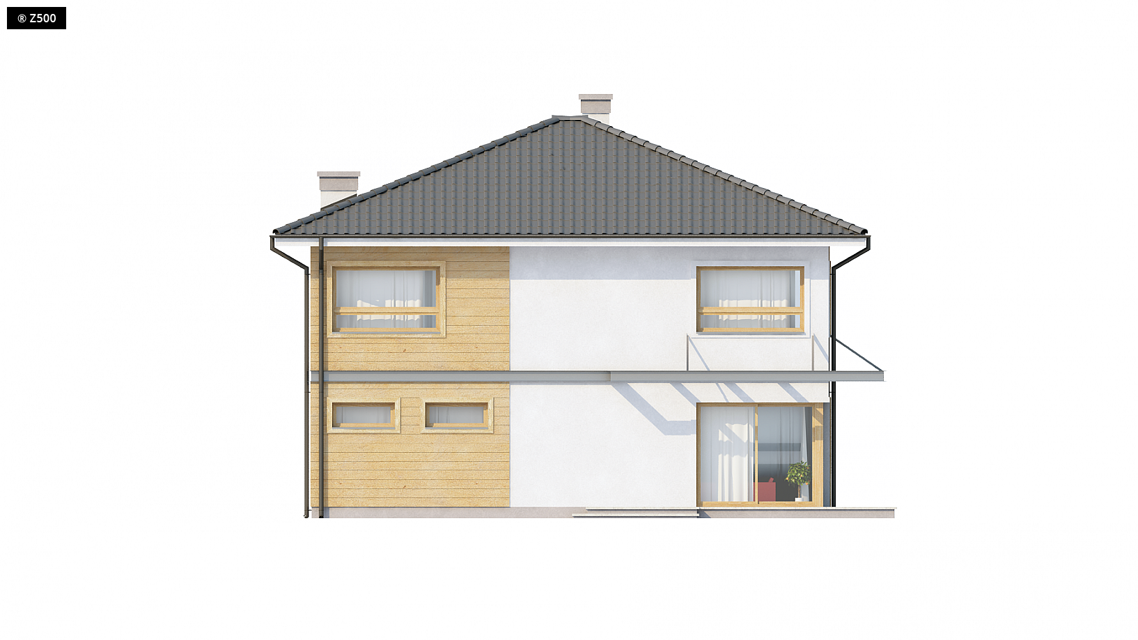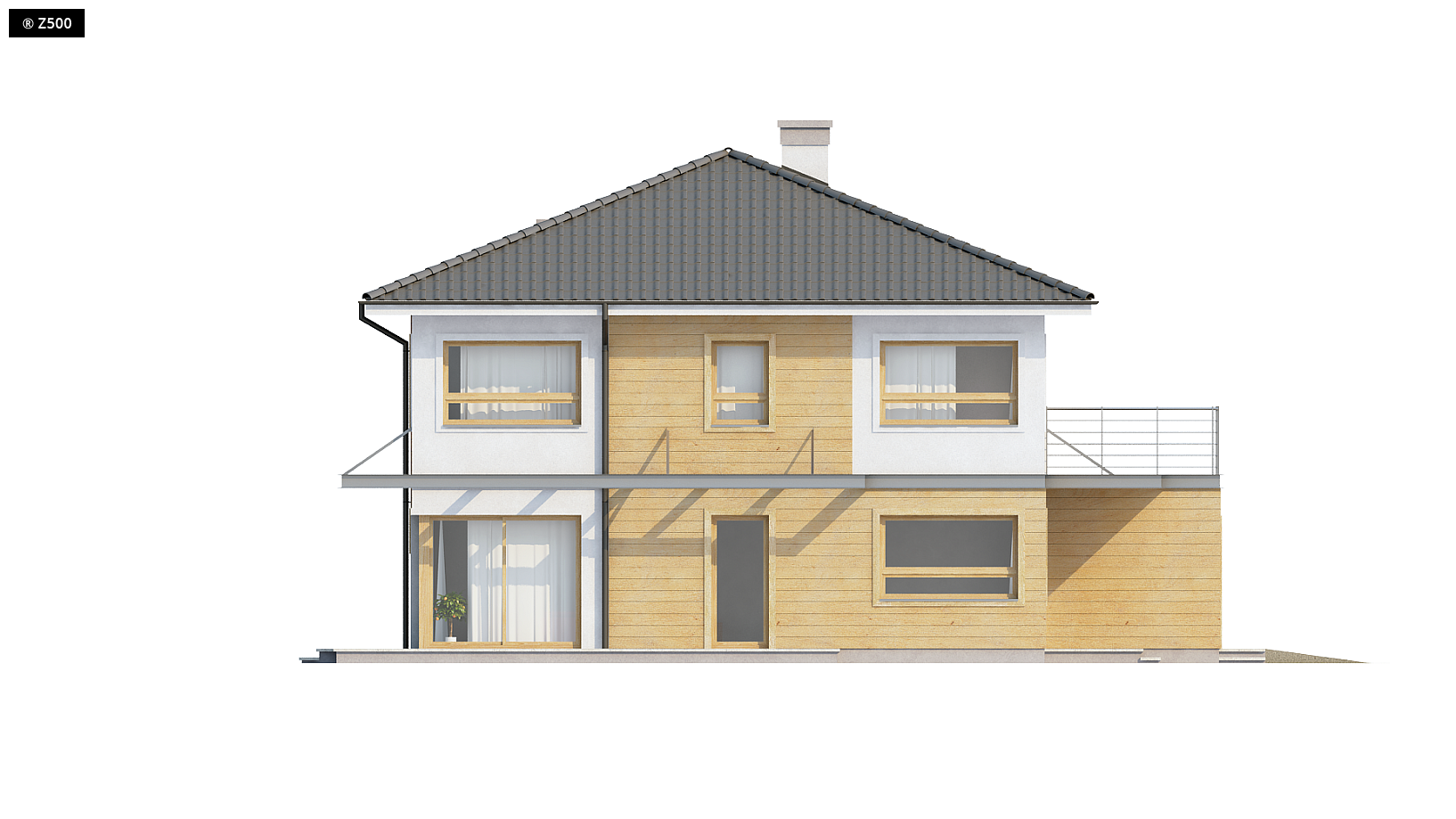 Zx7 to nowoczesny dom piętrowy z garażem dwustanowiskowym wysuniętym od frontu, dzięki czemu pasuje także do węższej działki. Charakterystyczna kubiczna forma została przekryta kopertowym dachem oraz wzbogacona elementami drewna na elewacjach. Projekt posiada przejrzysty układ funkcjonalny. Z sieni prowadzą przejścia do holu i garażu. W holu, który dzieli parter na część dzienną i gospodarczą, przewidziano miejsce na duże szafy. Pomieszczenie gospodarcze może być dostępne przez garaż lub łazienkę. Przestronny salon wraz z jadalnią i otwartą kuchnią tworzy komfortową przestrzeń dzienną. Strefa ta posiada dostęp na częściowo zadaszony taras. Kominek został wkomponowany w ścianę między jadalnią i holem. Na piętrze zaprojektowano cztery wygodne sypialnie, bardzo ustawne, garderobę i dwie łazienki w tym jedna prywatna. Jedna z sypialń posiada wyjście na taras nad garażem. Wszystkie pokoje na piętrze są pełnowymiarowymi pomieszczeniami bez skosów, co wpływa na ich ustawność i komfort użytkowania.