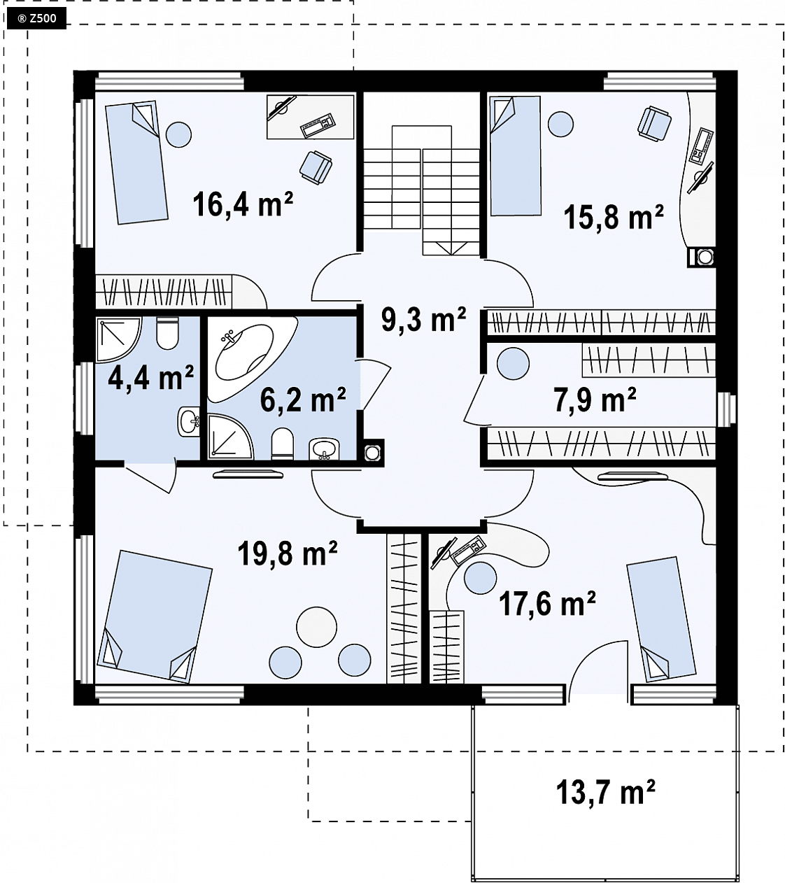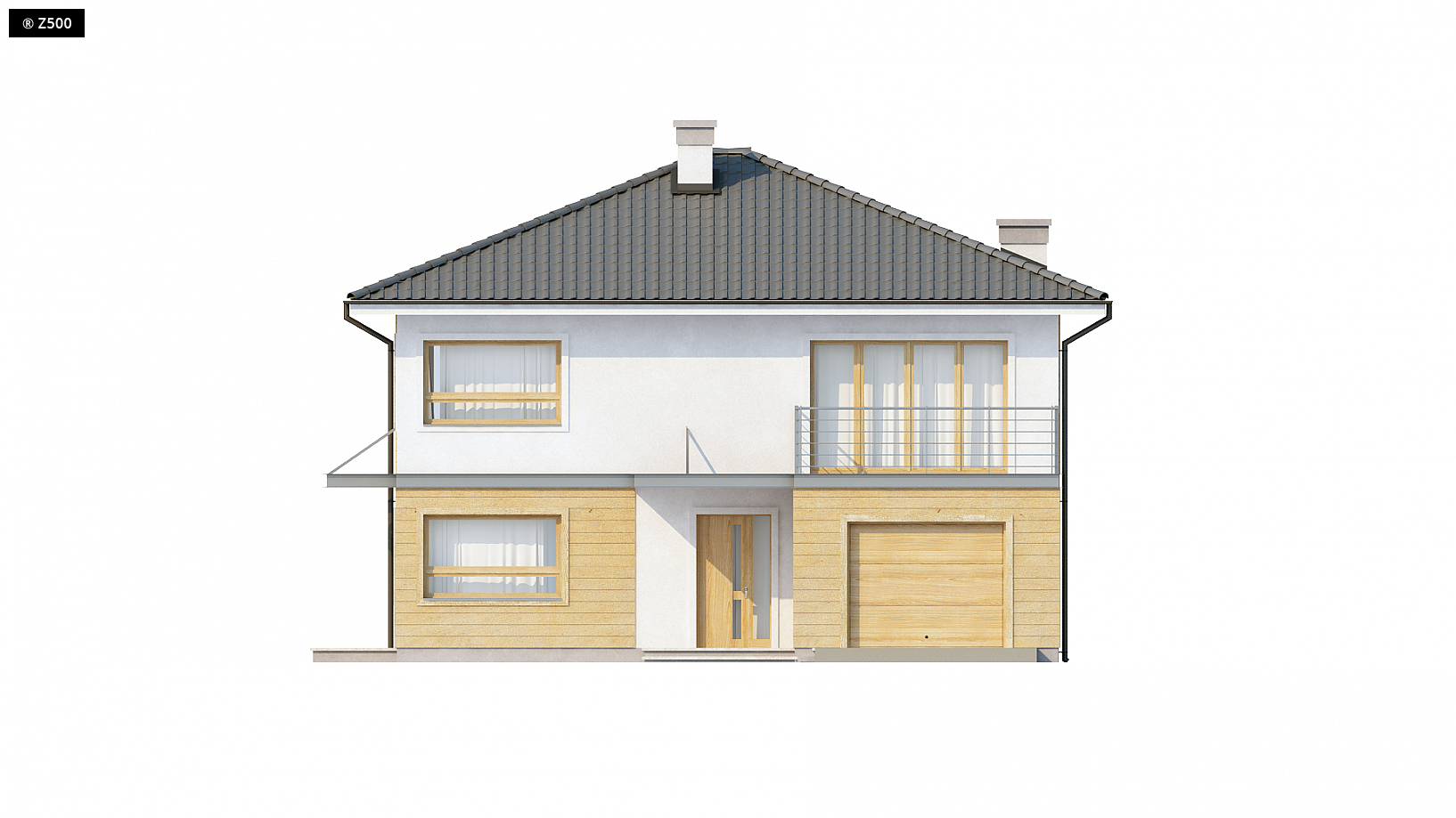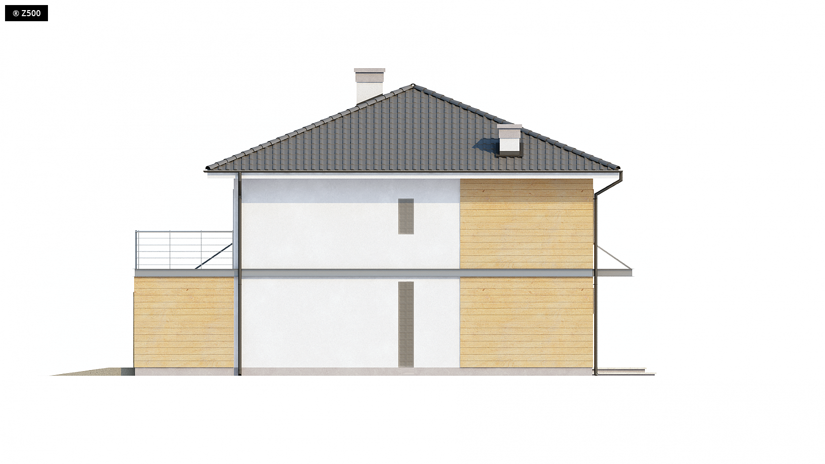 Zx7 to nowoczesny dom piętrowy z garażem dwustanowiskowym wysuniętym od frontu, dzięki czemu pasuje także do węższej działki. Charakterystyczna kubiczna forma została przekryta kopertowym dachem oraz wzbogacona elementami drewna na elewacjach. Projekt posiada przejrzysty układ funkcjonalny. Z sieni prowadzą przejścia do holu i garażu. W holu, który dzieli parter na część dzienną i gospodarczą, przewidziano miejsce na duże szafy. Pomieszczenie gospodarcze może być dostępne przez garaż lub łazienkę. Przestronny salon wraz z jadalnią i otwartą kuchnią tworzy komfortową przestrzeń dzienną. Strefa ta posiada dostęp na częściowo zadaszony taras. Kominek został wkomponowany w ścianę między jadalnią i holem. Na piętrze zaprojektowano cztery wygodne sypialnie, bardzo ustawne, garderobę i dwie łazienki w tym jedna prywatna. Jedna z sypialń posiada wyjście na taras nad garażem. Wszystkie pokoje na piętrze są pełnowymiarowymi pomieszczeniami bez skosów, co wpływa na ich ustawność i komfort użytkowania.
