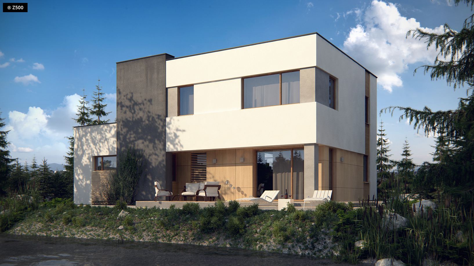 Zx59 to zgrabny dom piętrowy z garażem jednostanowiskowym o nowoczesnym charakterze. Na parterze znajduje się jednoprzestrzenna strefa dzienna, kuchnia i salon w kompozycji otwartej z wyjściem na zadaszony taras. Komfort użytkowania podnosi duża łazienka z oknem, obszerne pomieszczenie gospodarcze oraz wygodne schody ze spocznikiem. W kuchni można wydzielić osobną spiżarkę lub wykorzystać na ten cel schowek pod schodami. Kotłownię można jeszcze powiększyć przesuwając ściankę działową w sieni. Na piętrze zaprojektowano 3 podobnej wielkości pokoje. Główna sypialnia posiada własną garderobę oraz wyjście na taras nad garażem. Zx59 to dom zaprojektowany w duchu modernistycznej architektury. Okładziny elewacyjne z naturalnego drewna oraz ciekawa kolorystyka podkreślają jego nowoczesny wygląd. Oryginalnym dodatkiem jest wykusz od frontu, w którym mieści się klatka schodowa. Duże okno idealnie doświetla strefę komunikacyjną oraz podnosi walory estetyczne.