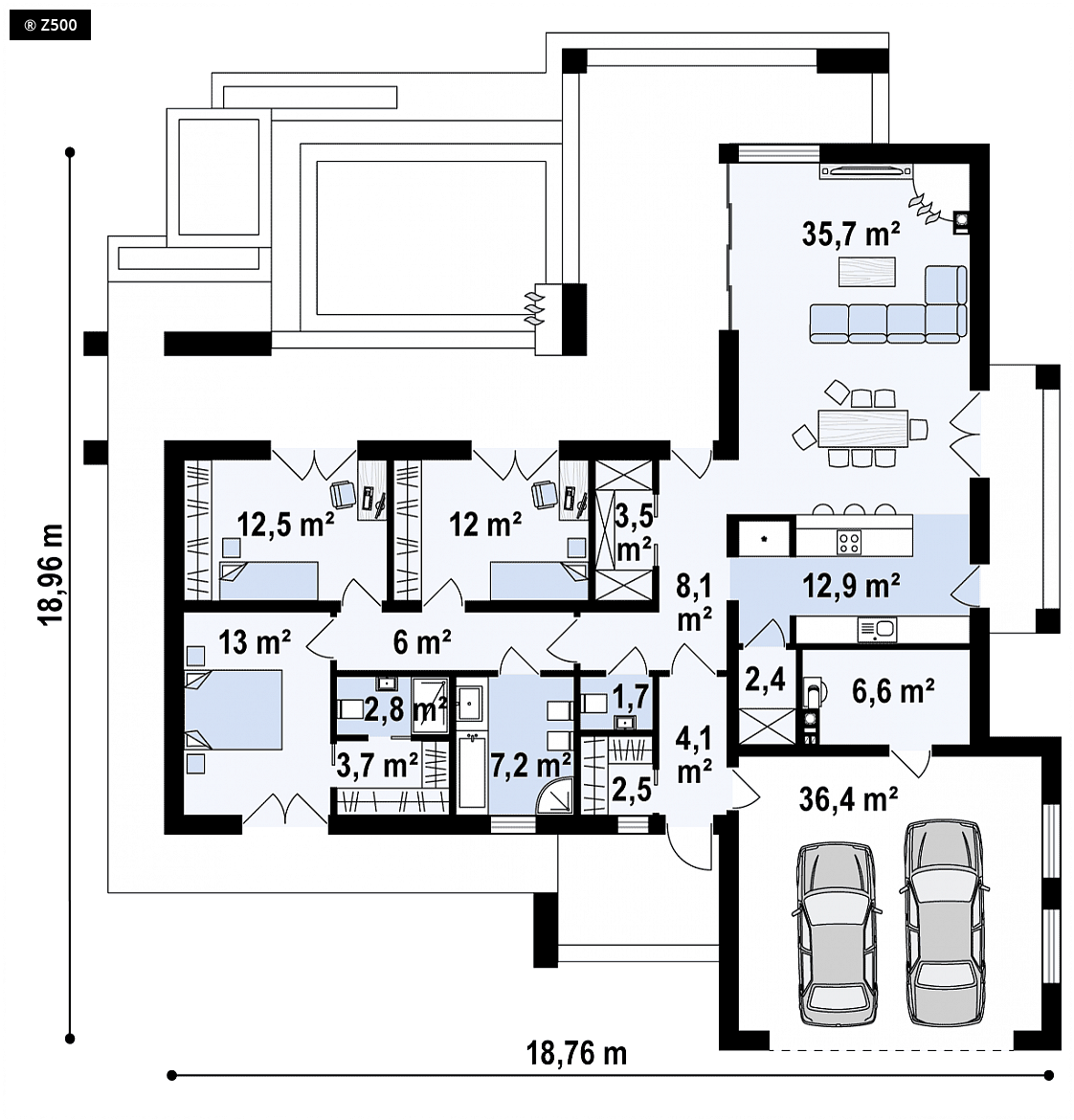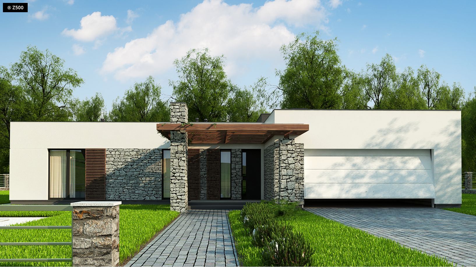 Zx137 to parterowy budynek z dwustanowiskowym garażem i płaskim dachem. Posiada duże przeszklenia i ażurowe zadaszenia nad częścią wejściową i ogrodową. Na wykończenie elewacji składa się surowa okładzina kamienna, cieplejsza okładzina drewniana w części ogrodowej, oraz tynk w kolorach białym i grafitowym. Przed domem posadzono klomby zieleni. Budynek posiada dwa wejścia. Frontowe, dzięki któremu jesienna słota nigdy nie rozgości się w naszej sieni, ponieważ wejście jest częściowo zadaszone. I drugie wyjście – prowadzące na taras z zewnętrznym kominkiem, dalej do ogrodu, gdzie wiosną cień drzew zagląda w zielony owoc, jak w oczy. Schowek może posłużyć jako dodatkowa garderoba lub „graciarnia” na choinkę, i inne rzadko używane przez domowników rzeczy. Prawa część domu jest częścią dzienną, lewa nocną. Kuchnię połączono z jadalnią i salonem na zasadzie open space. Dzięki temu jest przestronnie i możemy cieszyć się naszą reprezentacyjną powierzchnią. W lewej części domu zaprojektowano 3 sypialnie, w tym największą dla rodziców – posiada ona oddzielną łazienkę i garderobę. Pozostałe 2 pokoje mogą być przeznaczone dla dzieci.