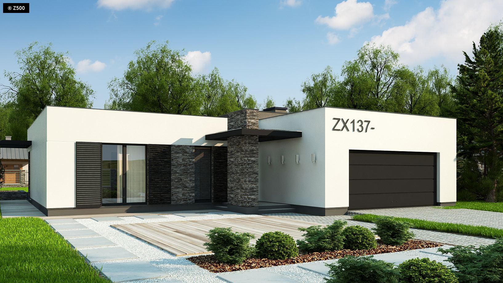 Zx137- to pomniejszona wersja projektu Zx137, dzięki czemu powierzchnia wynosi poniżej 100 m2. I może być domem MDM. Parterowy budynek z dwustanowiskowym garażem i płaskim dachem. Posiada duże przeszklenia i ażurowe zadaszenia nad częścią wejściową i ogrodową. Na wykończenie elewacji składa się surowa okładzina kamienna, cieplejsza okładzina drewniana w części ogrodowej, oraz tynk w kolorach białym i grafitowym. Przed domem posadzono klomby zieleni. Budynek posiada dwa wejścia. Frontowe, w którym jesienna słota nigdy nie zagości, ponieważ wejście jest częściowo zadaszone. I drugie wyjście – prowadzące na taras z zewnętrznym kominkiem, dalej do ogrodu, gdzie wiosną cień drzew zagląda w zielony owoc, jak w oczy. Schowek może posłużyć jako dodatkowa garderoba lub „graciarnia” na choinkę, i inne rzadko używane przez domowników przedmioty. Prawa część domu jest częścią dzienną, lewa nocną. Kuchnię połączono z jadalnią i salonem na zasadzie open space. Dzięki temu jest przestronnie i możemy cieszyć się naszą reprezentacyjną powierzchnią. W lewej części domu zaprojektowano 3 sypialnie, w tym największą dla rodziców. Pozostałe 2 pokoje mogą być przeznaczone dla dzieci. Projekt Zx137- dedykowany jest dla pary z dwojgiem dzieci.