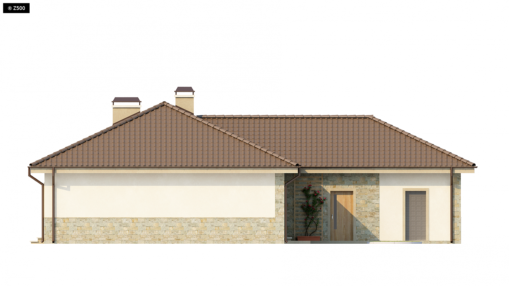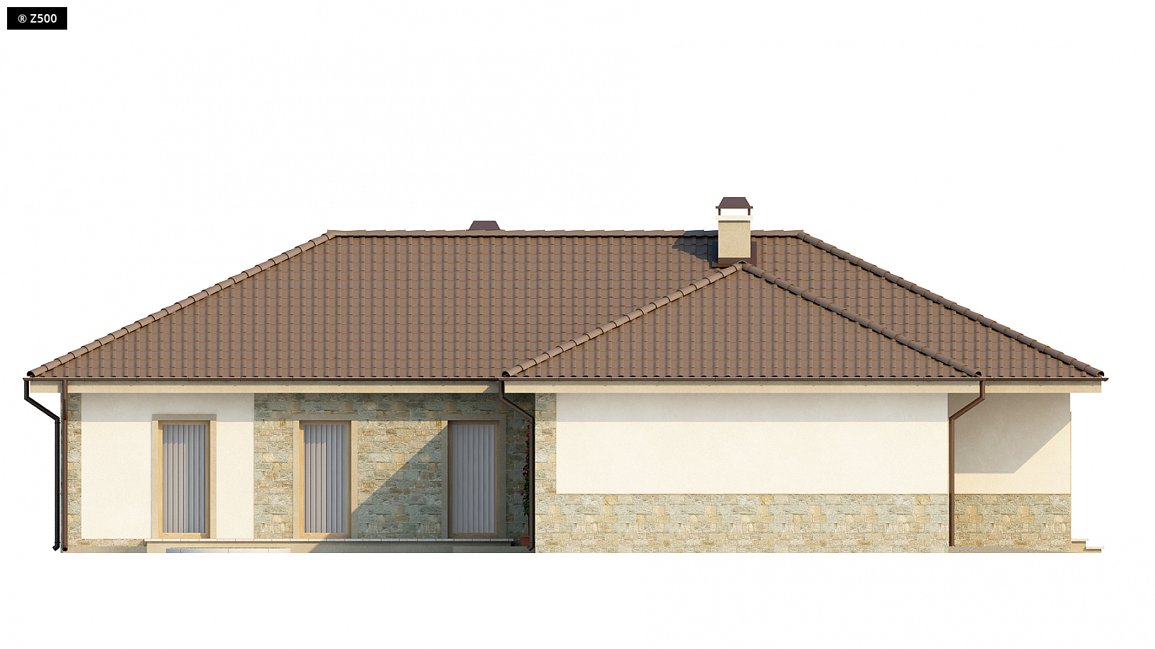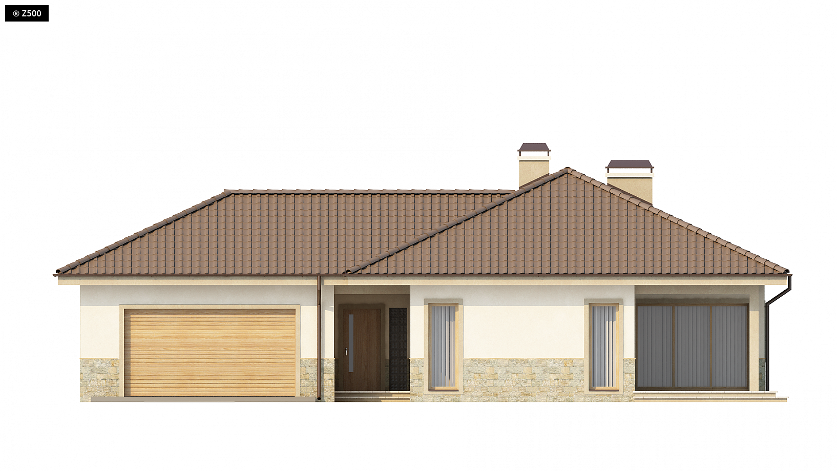 Projekt Z80 to dom o prostej, parterowej bryle z subtelnym detalem wykończenia elewacji w postaci naturalnej okładziny kamiennej. Jest to budynek, który klimatem nawiązuje do architektury skandynawskiej. Przez zadaszone wejście wchodzimy do obszernej sieni, w której przewidziano miejsca na szafy. Z holu głównego dostępna jest strefa dzienna, w której poszczególne przestrzenie przenikają się wzajemnie. Salon połączony jest z jadalnią, a kuchnia może być wydzielona ścianą lub pozostać częściowo otwarta. Pokoje oraz strefę sypialną umieszczono w tylnym skrzydle budynku, dzięki czemu każdy pokój posiada wyjście na zewnętrzne patio. Największa z sypialni ma prywatną łazienkę oraz wydzieloną garderobę. W lewej części domu znajduje się dwustanowiskowy garaż z pomieszczeniem gospodarczym na jego tyłach. W podstawowej wersji projektu wykonano strop, co pozwoli w miarę rosnących potrzeb zagospodarować częściowo strych.