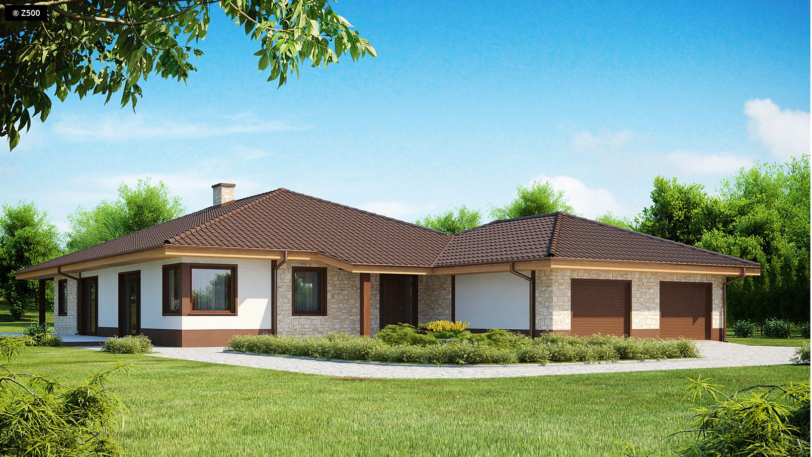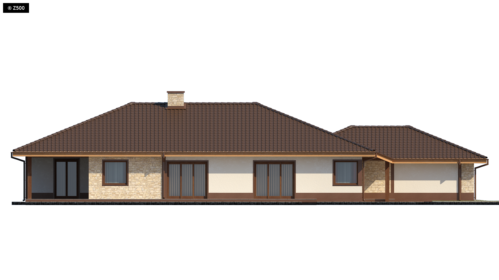 Z82 to projekt domu dla większej rodziny z rozbudowaną częścią dzienną i rozłożystą bryłą. Wejście do domu zostało ciekawie zaakcentowane przedłużeniem połaci dachu wspartej na słupku. Po prawej stronie od sieni znajduje się garderoba, skąd jest przejście do garażu i pomieszczenia gospodarczego zaprojektowanego na tyłach domu. Dom został podzielony na dwie strefy. W jednej znajdują się dwa pokoje, każdy z zadaszonym tarasem, sypialnia i dwie łazienki natomiast w drugiej duży i doświetlony salon połączony z jadalnią i otwartą kuchnią. Ponadto kuchnia od salonu częściowo oddzielona jest półścianką zakończoną stolikiem z krzesłami. Projekt Z82 to świetny pomysł na dom parterowy dla zwolenników pomieszczeń na jednym poziomie, ale z możliwością, w razie potrzeby, zagospodarowania dodatkowej przestrzeni na poddaszu. Możliwy do zamieszkania także dla osób niepełnosprawnych.