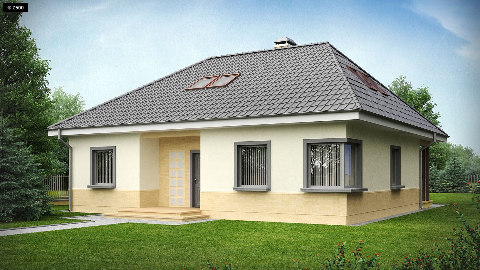 Projekt domu Z84 z poddaszem użytkowym stworzyliśmy na bazie parterowego projektu Z24. Prostokątny rzut, przykryty kopertowym dachem, współczesne wykończenie elewacji i funkcjonalne wnętrze, zaspokoją z nawiązką wymagania przyszłych mieszkańców. Parter podzielono na dwie niezależne strefy: dzienną i nocną. Część dzienną stanowią: przestronny salon z jadalnią i kominkiem oraz kuchnia, z której wydzielono spiżarkę. Taras od strony ogrodu usytuowany jest w podcieniu. W celu ograniczenia kosztów budowy w pomieszczeniu gospodarczym zaprojektowano tylko jeden komin, który sąsiaduje z kominkiem w salonie, co ułatwia wykonanie ekonomicznych instalacji z ogrzewaniem kominkowym lub „płaszczem wodnym". Na poddaszu znajdują się trzy obszerne sypialnie oraz łazienka. Jest także sporo powierzchni na wnękowe szafy oraz garderobę. Zaletą projektu Z84 jest fakt, że może być realizowany etapami. Najpierw można urządzić mieszkanie na parterze, a w okresie późniejszym, zaadaptować poddasze.