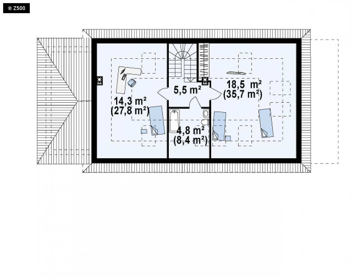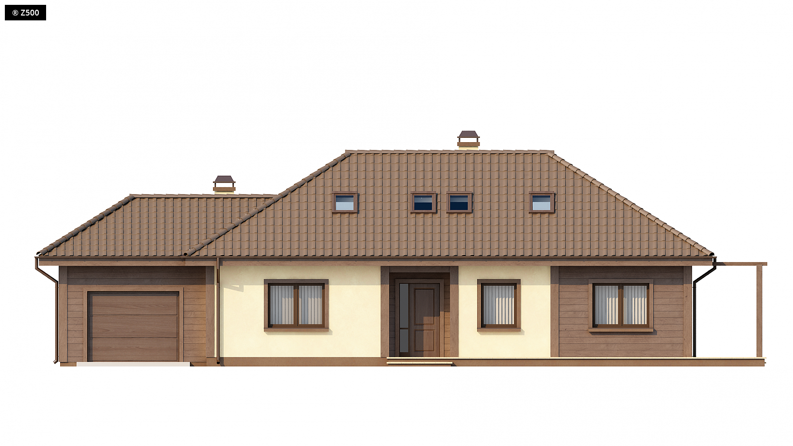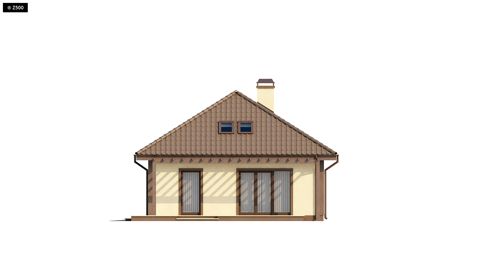 Projekt domu Z90 to ciekawa propozycję budynku z poddaszem i bocznym garażem. Jest to dom o prostej bryle, przekryty kopertowym dachem. Wejście do budynku zaakcentowane jest małym podcieniem. Sień, z której istnieje możliwość przejścia do spiżarki, oraz hol dzielą parter domu na dwie części. Z centralnie umieszczonego holu mamy swobodny dostęp do strefy dziennej, czyli salonu z kuchnią, oraz nocnej . Projekt uwzględnia także duże pomieszczenie gospodarcze z bezpośrednim przejściem do garażu. W części prywatnej znajduje się sypialnia oraz przestronna łazienka. Z holu wydzielono klatkę schodową prowadzącą na poddasze, gdzie znajdują się dwie przestronne sypialnie. W razie potrzeby poddasze można zaaranżować tak aby powstały 3 pokoje. W podstawowym wariancie Z90 przewidziano możliwość rezygnacji z okien w tylnej ścianie budynku, co może okazać się korzystne dla nieustawnych działek. Jako opcja przewidzieliśmy także wariant z oknami i tarasem na tylnej ścianie.