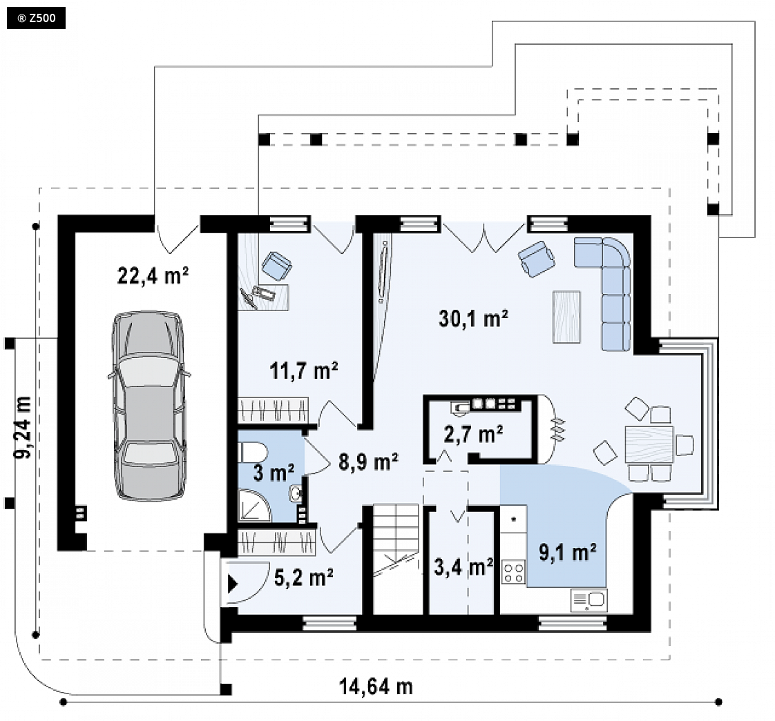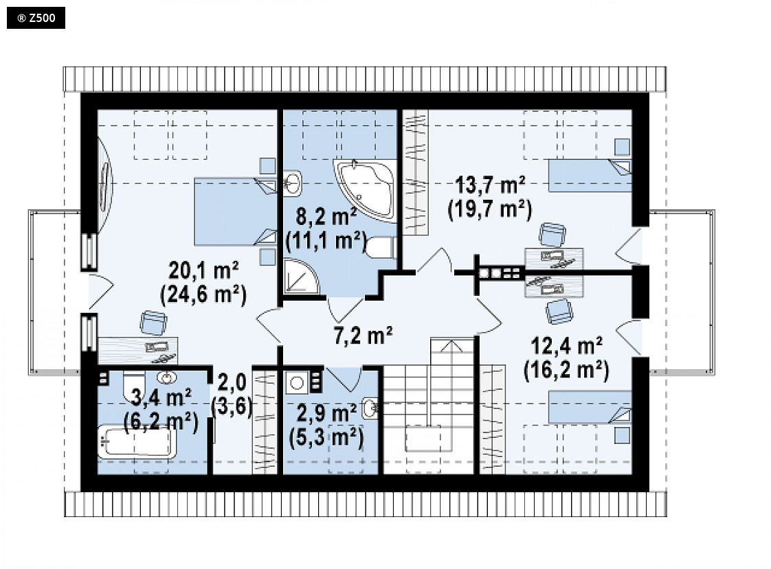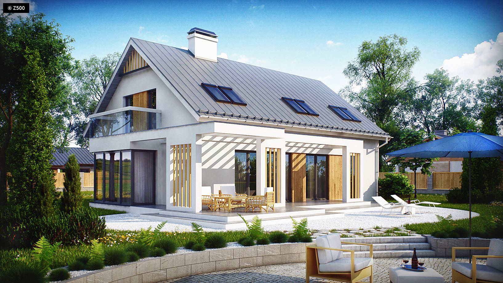 Projekt Z235 to piętrowy dom z dwuspadowym dachem i jednostanowiskowym garażem. Efektowne wykończenie elewacji, poprzez wkomponowanie drewnianych elementów podkreśla jego wyjątkowy charakter. Wnętrze domu jest wygodne i funkcjonalne, podzielone na strefy. Parter to część dzienna domu, znajduje się tu przestronny salon połączony częściowo z jadalnią w wykuszu i kuchnią. Z pokoju dziennego jest możliwość wyjścia na taras. W lewej części domu zlokalizowano pokój, który może służyć jako gabinet lub pokój gościnny, oraz łazienkę z prysznicem. Piętro to strefa wypoczynkowa z trzema wygodnymi, obszernymi sypialniami, dwoma łazienkami i pralnią. Główna sypialnia posiada własną łazienkę. Z235 to idealna propozycja dla osób lubiących innowacyjne rozwiązania. Dom łączy w sobie najlepsze cechy domu jednorodzinnego: jest praktyczny w użytkowaniu i nietypowy w wyglądzie.