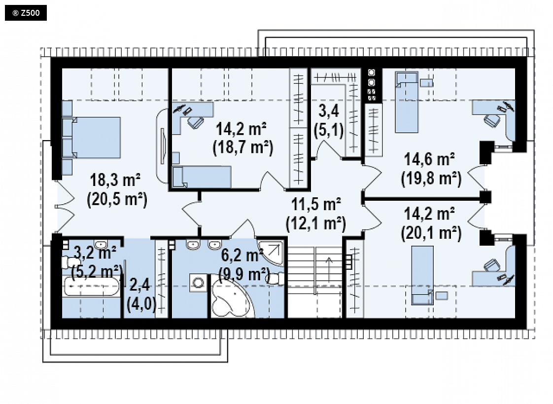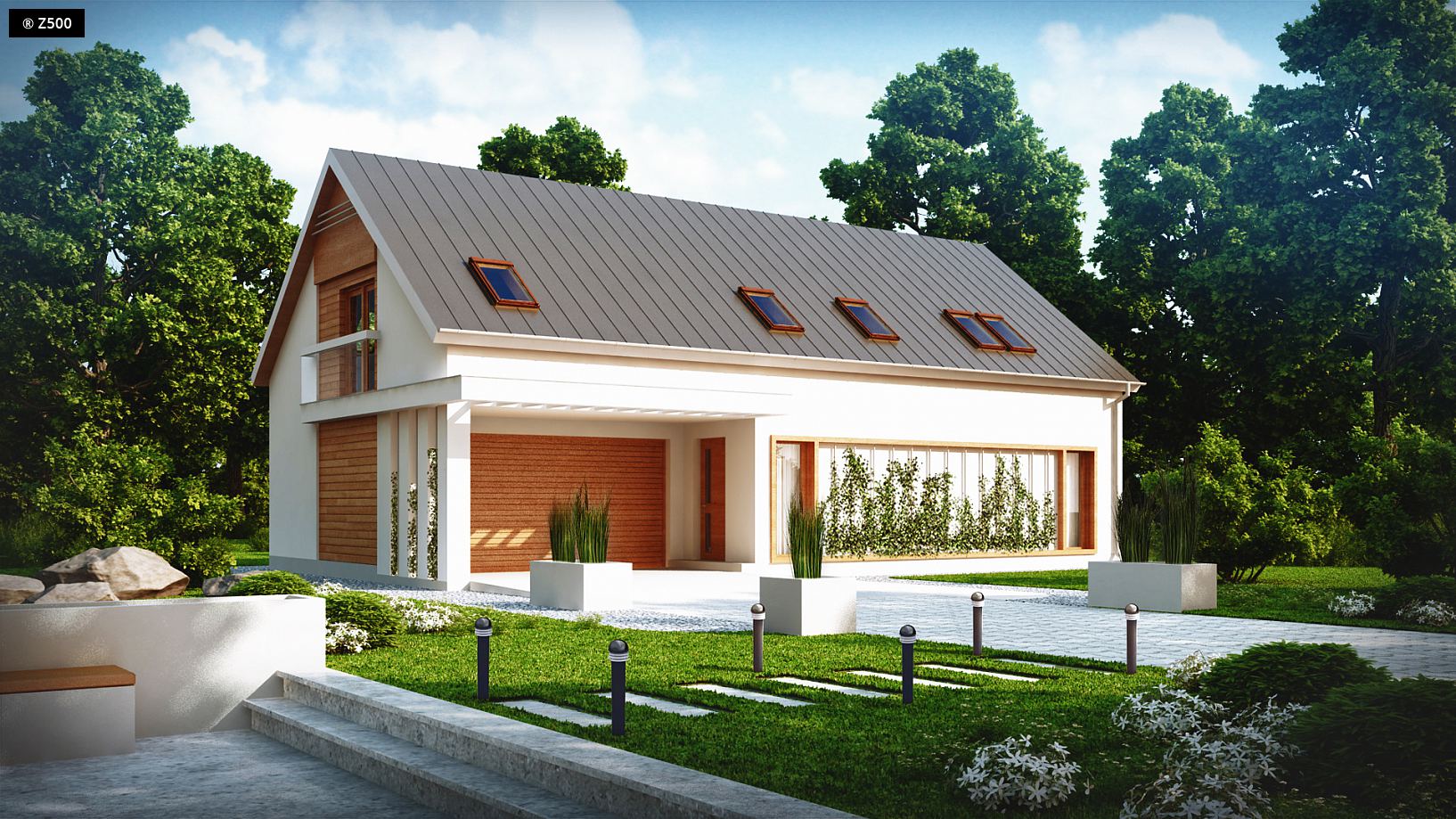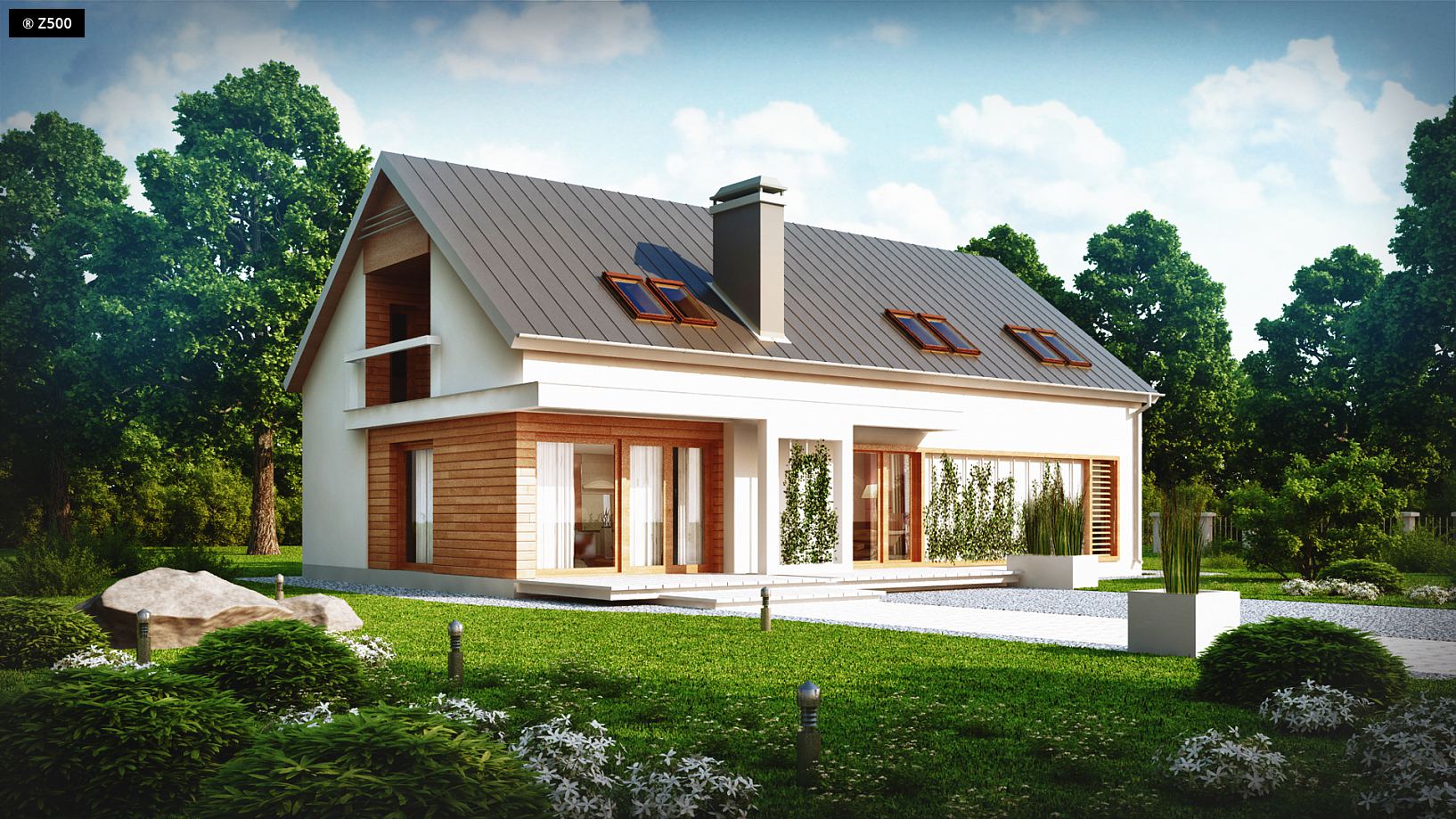 Projekt Z238 to dom z dwuspadowym dachem i garażem dwustanowiskowym. Zwarta bryła oraz przemyślany i sprawdzony układ pomieszczeń powodują, że dom jest wygodny i funkcjonalny. Z podcienia wejściowego przechodzimy do sieni, w której wydzielono miejsce na szafy. Z centralnie zlokalizowanego holu jest dostęp do strefy dziennej, którą tworzy przestronny salon połączony jednoprzestrzennie z kuchnią i jadalnią. Na parterze znajduje się również gabinet, łazienka z pomieszczeniem gospodarczym i dwustanowiskowy garaż. Na piętrze umieszczono cztery sypialnie, w tym jedną z prywatną łazienką i garderobą. Duża, wspólna łazienka pomieści prysznic i wannę, dodatkowo posiada ona wydzielone miejsce na pralnię. W każdym z pokoi znajdzie się miejsce na szafy. Z238 to propozycja dla osób szukających domu o funkcjonalnym wnętrzu. Pełna gama pomieszczeń sprawia, że znajdzie się tu miejsce dla każdego z domowników.