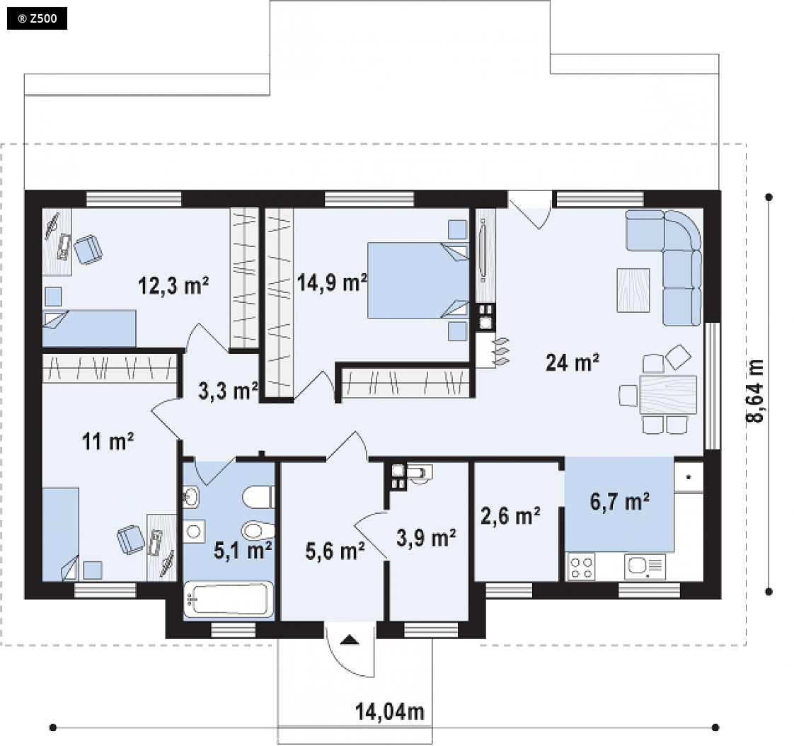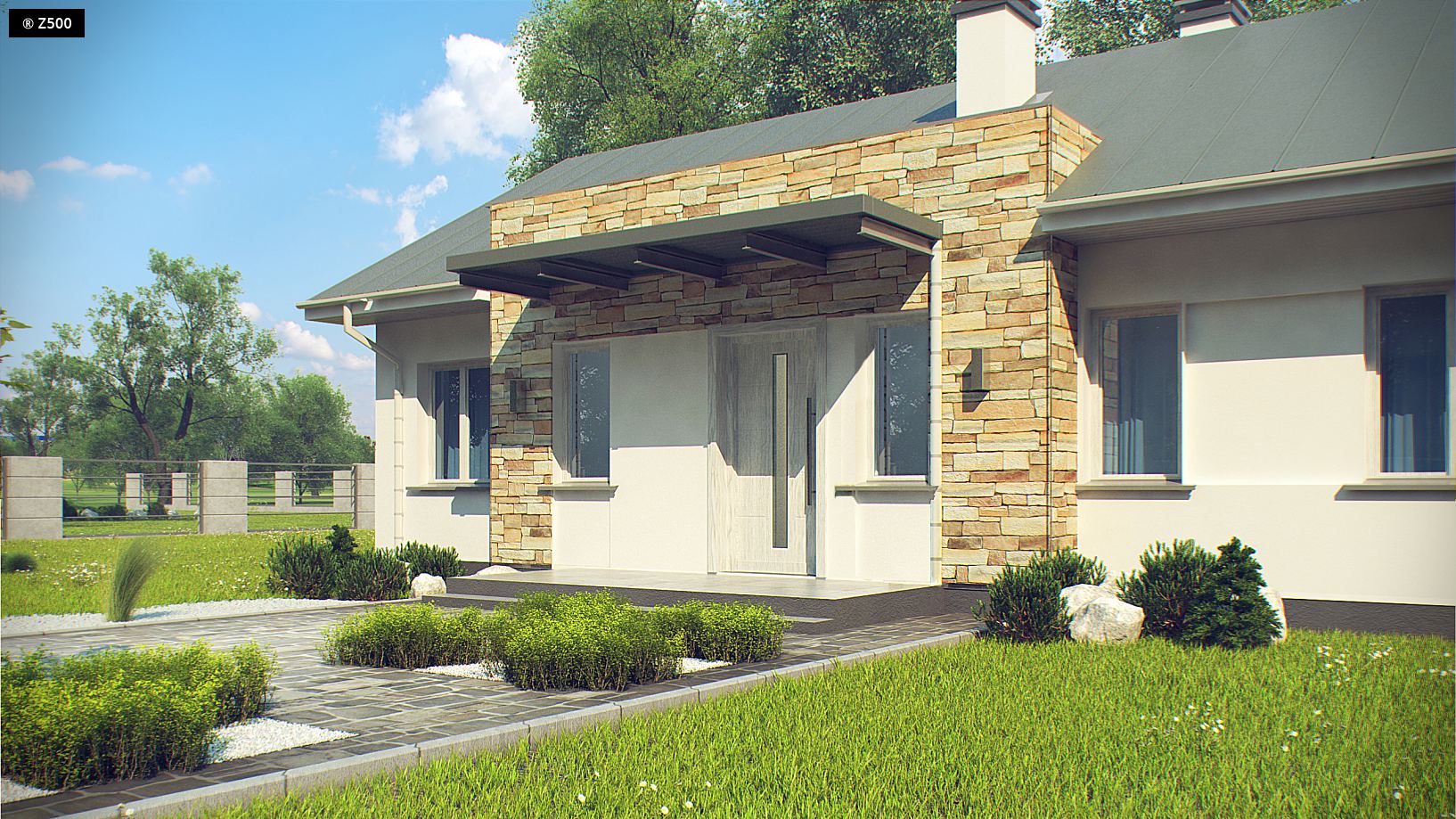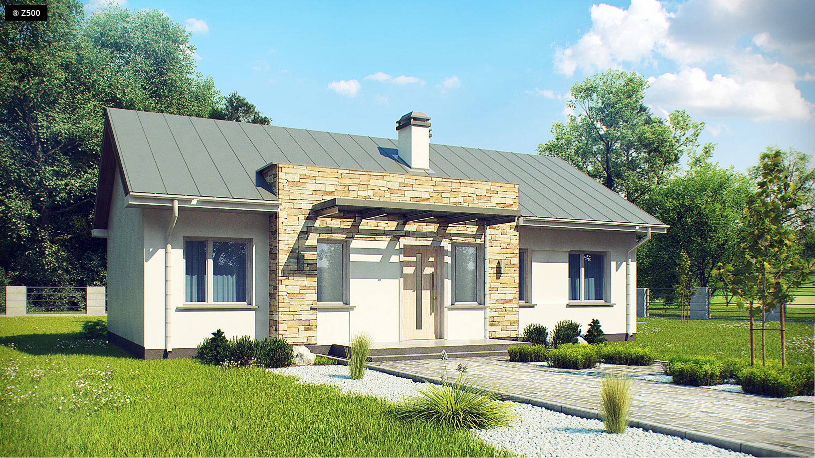 Z309 to zgrabny domek z dwuspadowym dachem nawiązujący do tradycji. Na szczególną uwagę zasługuje praktyczne i funkcjonalne rozmieszczenie pomieszczeń. Do sieni wchodzimy przez zadaszone wejście. Dalej znajduje się niewielki korytarzyk skąd mamy dostęp do wszystkich pomieszczeń. Strefa dzienna została zlokalizowana w prawej części domu. Wygodne połączenie kuchni i salonu znacznie powiększa cały pokój. Dzięki dużym przeszkleniom pomieszczenie, to jest dobrze doświetlone. W domku zostały zaprojektowane trzy ustawne sypialnie, każda z miejscem na szafę oraz przestronna łazienka. Z309 przypadnie do gustu wszystkim tym, którzy szukają niewielkiego, funkcjonalnego domu parterowego.