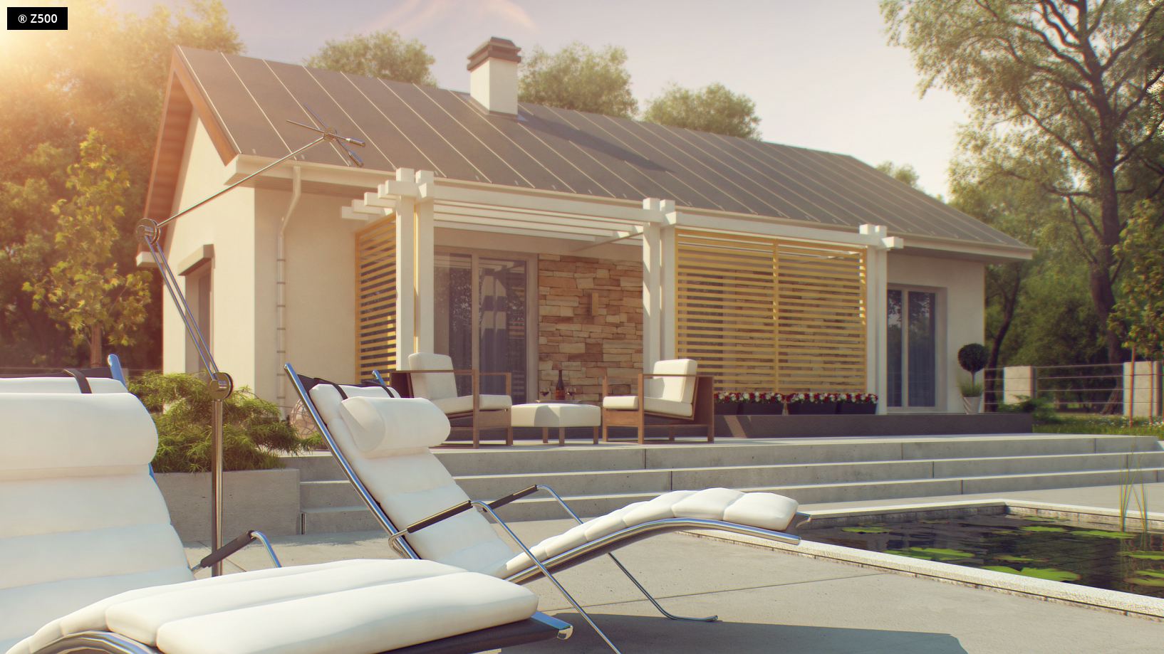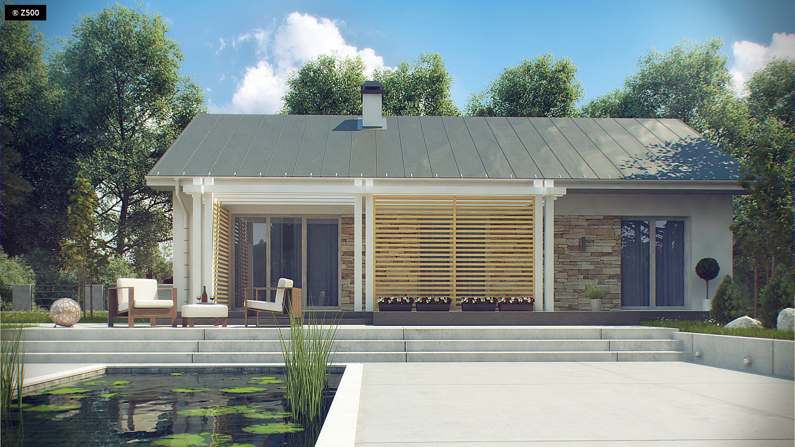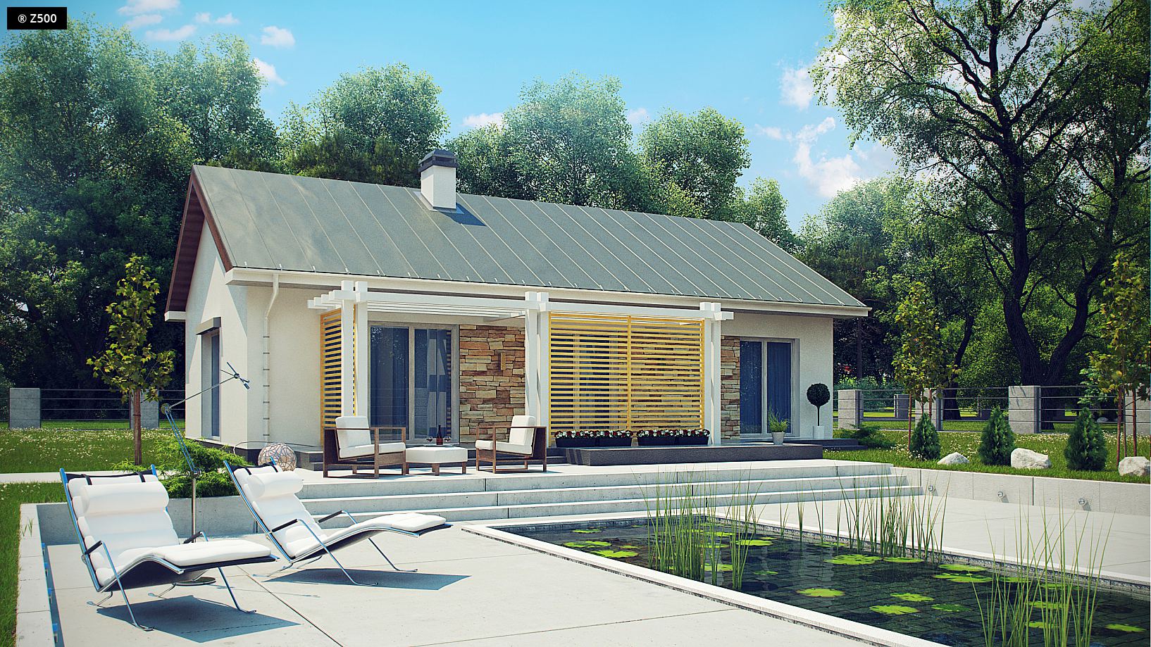 Z309 to zgrabny domek z dwuspadowym dachem nawiązujący do tradycji. Na szczególną uwagę zasługuje praktyczne i funkcjonalne rozmieszczenie pomieszczeń. Do sieni wchodzimy przez zadaszone wejście. Dalej znajduje się niewielki korytarzyk skąd mamy dostęp do wszystkich pomieszczeń. Strefa dzienna została zlokalizowana w prawej części domu. Wygodne połączenie kuchni i salonu znacznie powiększa cały pokój. Dzięki dużym przeszkleniom pomieszczenie, to jest dobrze doświetlone. W domku zostały zaprojektowane trzy ustawne sypialnie, każda z miejscem na szafę oraz przestronna łazienka. Z309 przypadnie do gustu wszystkim tym, którzy szukają niewielkiego, funkcjonalnego domu parterowego.