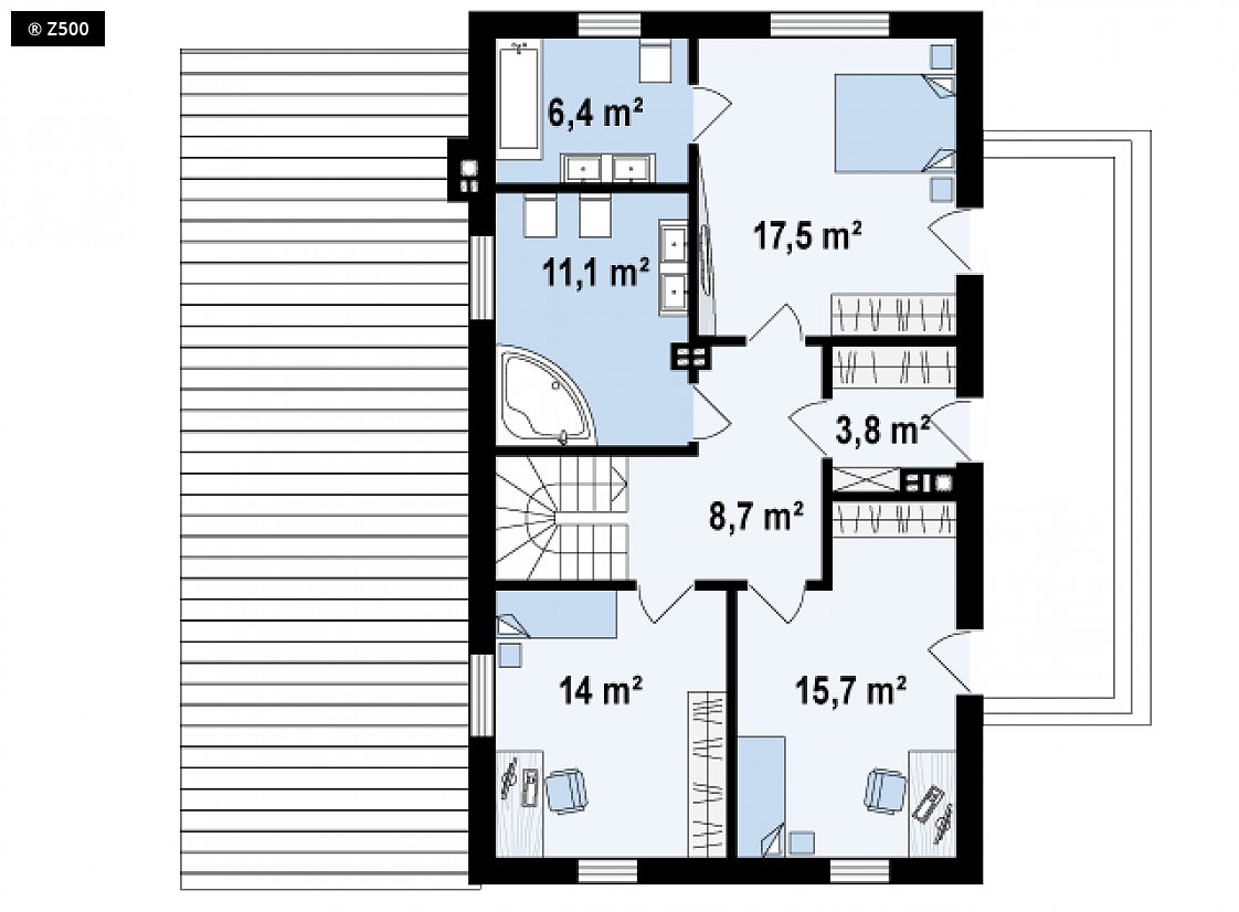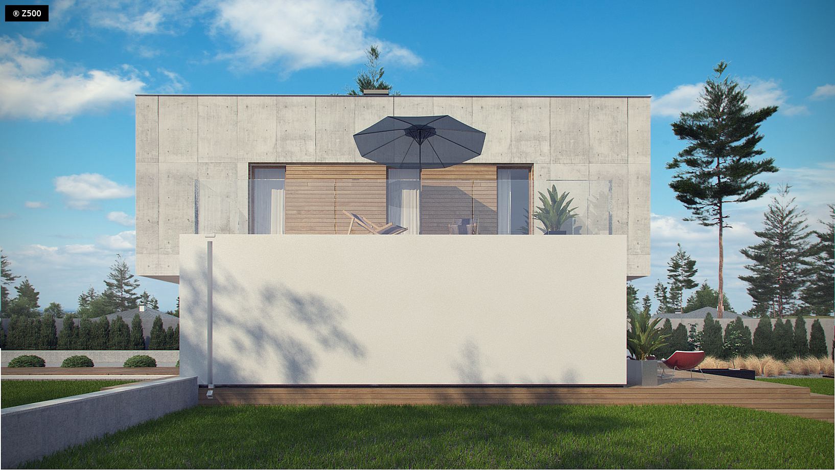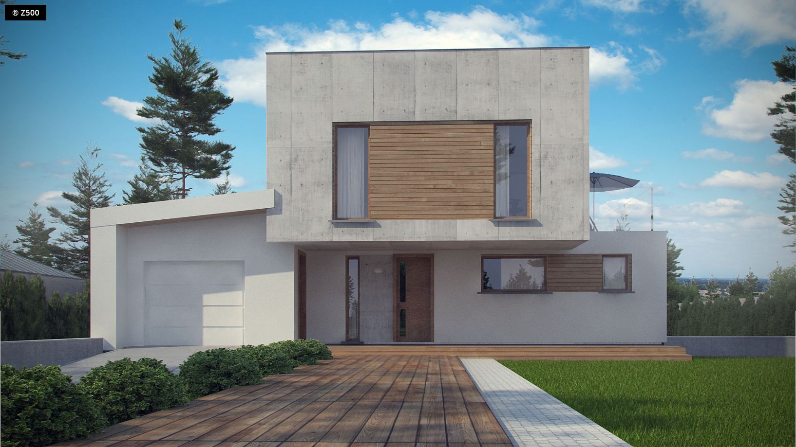 Projekt Zx121 to nowoczesny dom piętrowy z tarasem i garażem jednostanowiskowym. Dom kryje wygodną i funkcjonalną przestrzeń dzięki odpowiedniemu kształtowi budynku. Składa się z dwóch podstawowych brył geometrycznych, prostopadle nałożonych jedna na drugą. Daje to interesujący efekt wizualny i zapewnia zadaszenie na tarasie oraz nad wejściem do domu. Z wyżej wspomnianego garażu możemy dostać się do spiżarni, stamtąd z kolei, do kuchni. Jest to bardzo praktyczne rozwiązanie w przypadkach gdy wracamy z większych zakupów spożywczych. Wówczas bezpośrednio z garażu zostawiamy nasz prowiant w spiżarce. Stamtąd dzieli nas już tylko jeden krok do naszego kuchennego królestwa. Dzięki temu, podczas przygotowywania uczty dla podniebienia mamy wszystko co nam potrzebne „pod ręką”, jednocześnie zachowując wokół ład i porządek. Bezpośrednio z garażu można przebić wejście do garderoby, która jest połączona z sienią – nie trzeba będzie wychodzić na zewnątrz domu w mroźne dni aby dostać się bezpośrednio do samochodu. Niewątpliwą zaletą jest również osobne wejście z garażu do pomieszczenia gospodarczego, połączonego z tylnym wyjściem na ogród, w którym możemy ustawić przedmioty i urządzenia przydatne w ogrodzie, jak i potrzebne ubrania na zmianę. Na parterze, w centralnym miejscu przestronnego salonu umieszczono kominek. Salon możemy jeszcze powiększyć o aneks kuchenny i część jadalną likwidując ściankę oddzielającą go od kuchni. Zaplanowano również dodatkowy pokój z przylegającą do niego łazienką – idealnym miejscem na odprężającą kąpiel w wannie pełnej piany. Na piętrze znajdują się trzy sypialnie, jedna z łazienką i garderobą, druga z wnęką, którą można wykorzystać na garderobę lub „kącik majsterkowicza” i trzecia, która może mieć wyjście na dach garażu jako taras. Oddzielna duża łazienka dla całej rodziny stanowi dodatkowy atut. Można w niej trzymać rzeczy, które nie są przeznaczone dla oczu odwiedzających nas gości. Dobra komunikacja, funkcjonalność i umiejętność wykorzystania każdego zakamarka pomieszczeń pomoże nam zyskać miano „idealnej pani domu” i „dobrego gospodarza”.