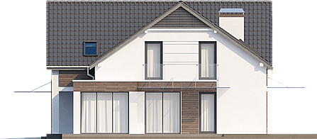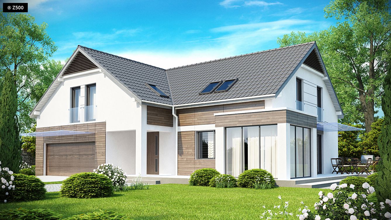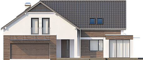 Projekt Z138 przestronny i niesłychanie komfortowy dom jednorodzinny z garażem dwustanowiskowym w bryle budynku. Ciekawa architektura oraz komfortowe wnętrze sprawiają, że dom doskonale harmonizuje z otaczającą go zielenią ogrodu. Biała, tynkowa elewacja została połączona z naturalnymi, drewnianymi elementami okładziny. Nowoczesności dodają duże okna bez podziałów oraz przeszklenia tworzące balustrady i zadaszenia. Frontową ścianę budynku urozmaica podcień nad werandą, z którego przechodzi się do środka domu. Rozległy taras okalający budynek będzie doskonałym miejscem relaksu na świeżym powietrzu. Dobrze pomyślany układ pomieszczeń oraz maksymalnie zagospodarowana przestrzeń to główne zalety domu Z138. W projekcie pomyślano o zaplanowaniu pomieszczeń pomocniczych, na które składa się garaż na dwa samochody, zlokalizowane za nim pomieszczenie techniczne, którym można przechowywać narzędzia samochodowe, przedsionek chroniący dom przed utratą ciepła, a także pomieszczenie przeznaczone na kotłownię oraz spiżarnia znajdująca się w kuchni. Reprezentacyjnym pomieszczeniem jest przestronny salon z kominkiem tworzącym nastrój oraz umilającym czas mieszkańcom. Kuchnia została połączona z jadalnią w przeszklonym, kwadratowym wykuszu, co ułatwi przenoszenie potraw w czasie przyjęć rodzinnych. W tylnej części zaplanowano dodatkowy pokój z łazienką oraz garderobą, który będzie idealny dla seniora. Przestronne poddasze domu Z138 jest luksusową częścią prywatną domu. Zaprojektowano tu wszystkie potrzebne mieszańcom pomieszczenia. Oprócz trzech obszernych sypialni zlokalizowano tu dwie garderoby, w tym jedną wspólną dla wszystkich, łazienkę z sauną oraz pralnię z suszarnią.