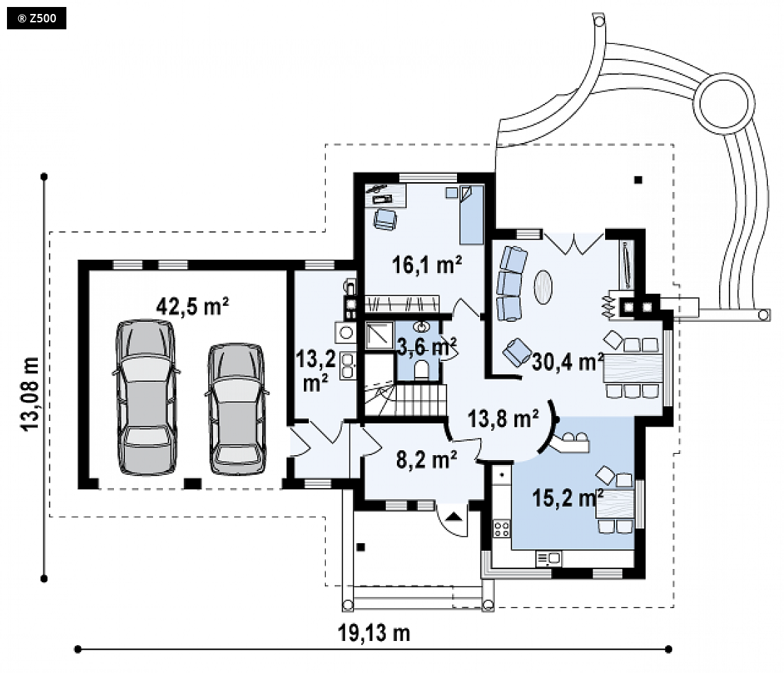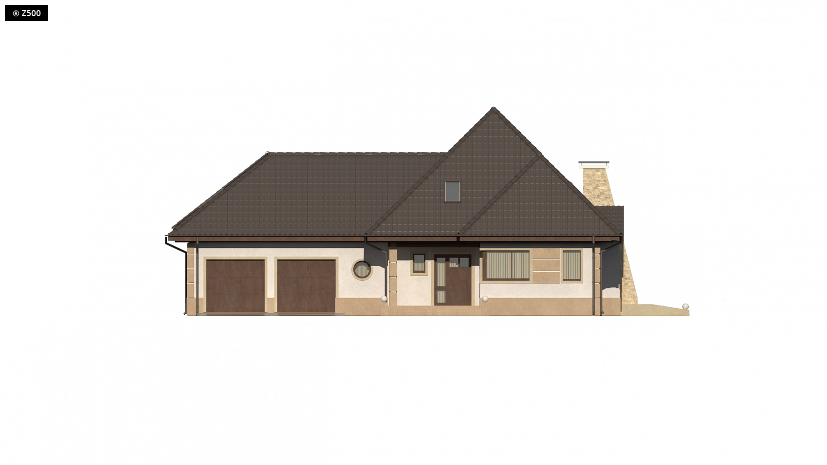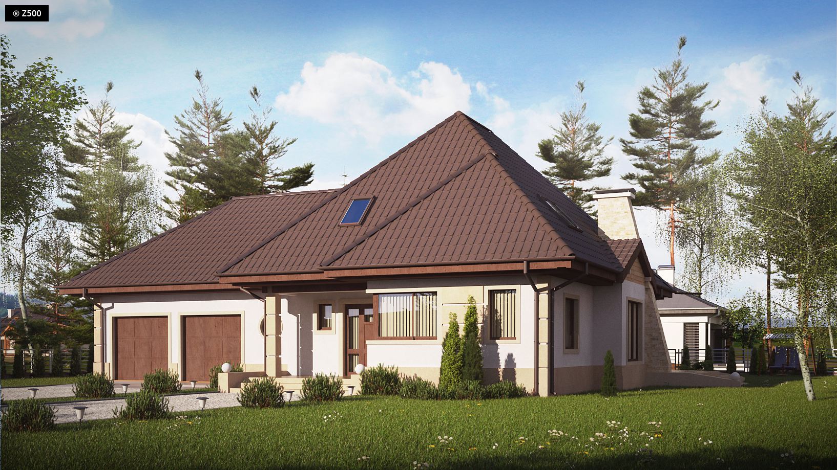 Wariant z garażem dwustanowiskowym po prawej stronie i pomieszczeniem rekreacyjnym na poddaszu.